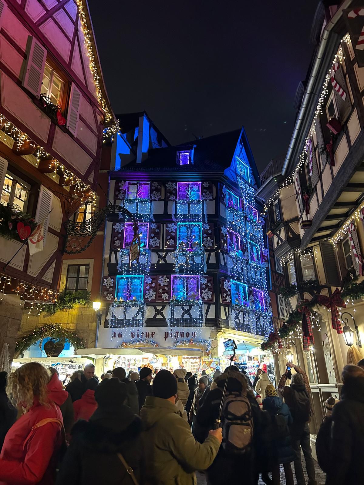 Due cose colpiscono di Colmar, se si va nel periodo dell’Avvento. La prima è la luce pazzesca che illumina le case a graticcio e che fa capire come mai la Disney abbia scelto un borgo nei dintorni (che è uguale, ma più piccolo) per creare il paesino dove vive Belle. La seconda è la folla: abitanti 68 mila, quindi grande circa come Vigevano, durante il periodo dei mercatini di Natale si riempie all’inverosimile. Fa parte del gioco: tutti hanno diritto di viaggiare negli stessi posti per vedere e mangiare le stesse cose.