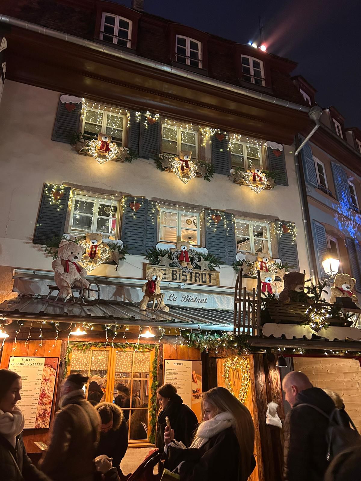 I mercatini di Natale, piccoli agglomerati di casette, scandiscono il centro. Siamo in Alsazia e quindi si mangia alsaziano: würstel (che qui chiamano “knacker”, perché scrocchiano in bocca per via della pelle), crauti, patate, formaggi. Poco altro. Per tre giorni va bene, dopo si cerca qualsiasi altra soluzione. Essendo terra di confine, con un dialetto che è variante del basso tedesco e non del francese, si notano varie peculiarità a partire dai toponimi. Un’altra caratteristica irrinunciabile è il vino: Gewürztraminer, Riesling, Pinot gris, Muscat sono etichette prestigiose e rinomate nel mondo. Qui si possono gustare nelle infinite cantine (rare in città, ubique nei dintorni e se vedono che sei ben disposto a comprare, gli assaggi sono gratis) o al bicchiere anche nelle bancarelle dei mercatini.
