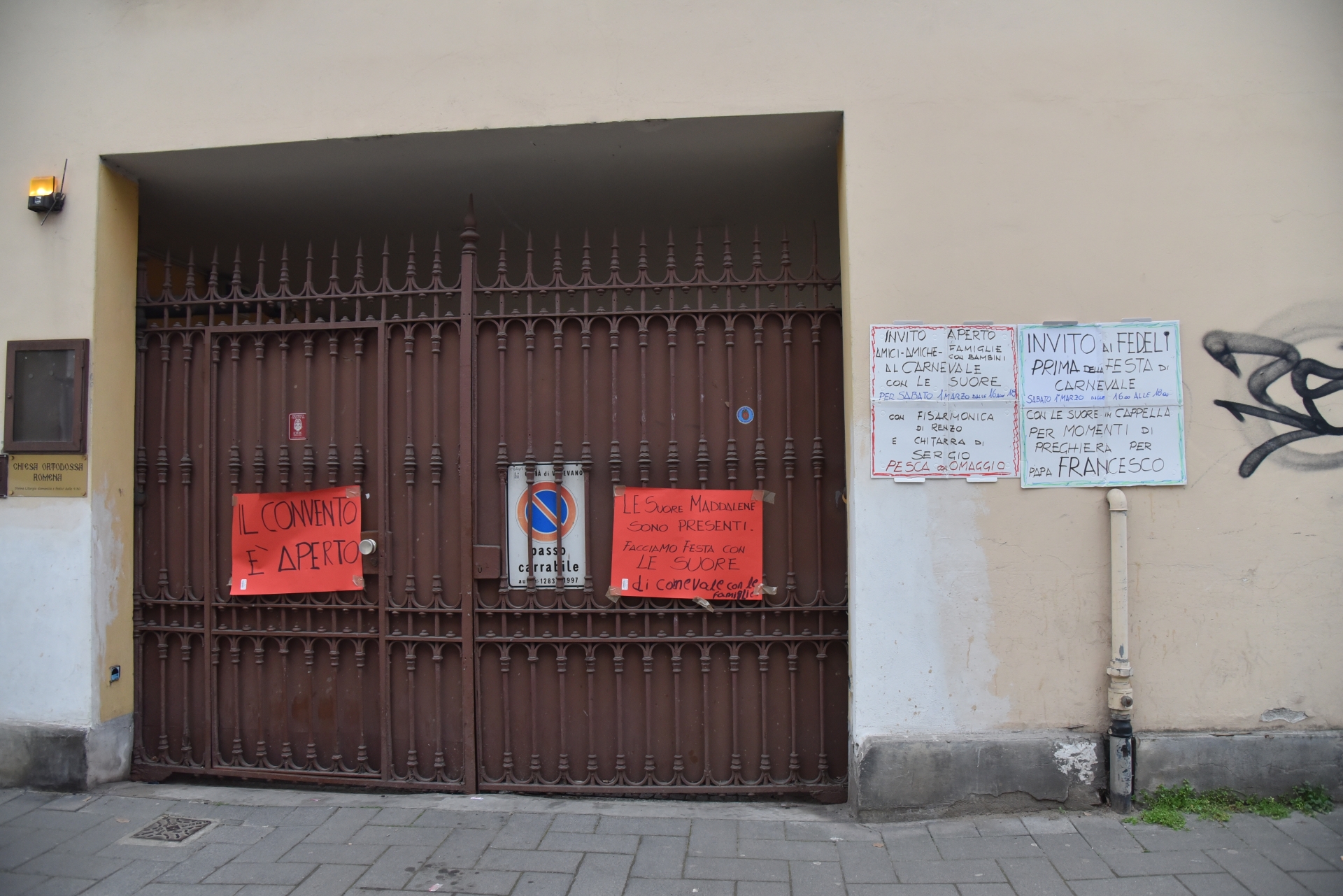 Il cartello affisso nei giorni scorsi sul cancello d'ingresso dell'istituto di corso Genova che informa che il convento è aperto
