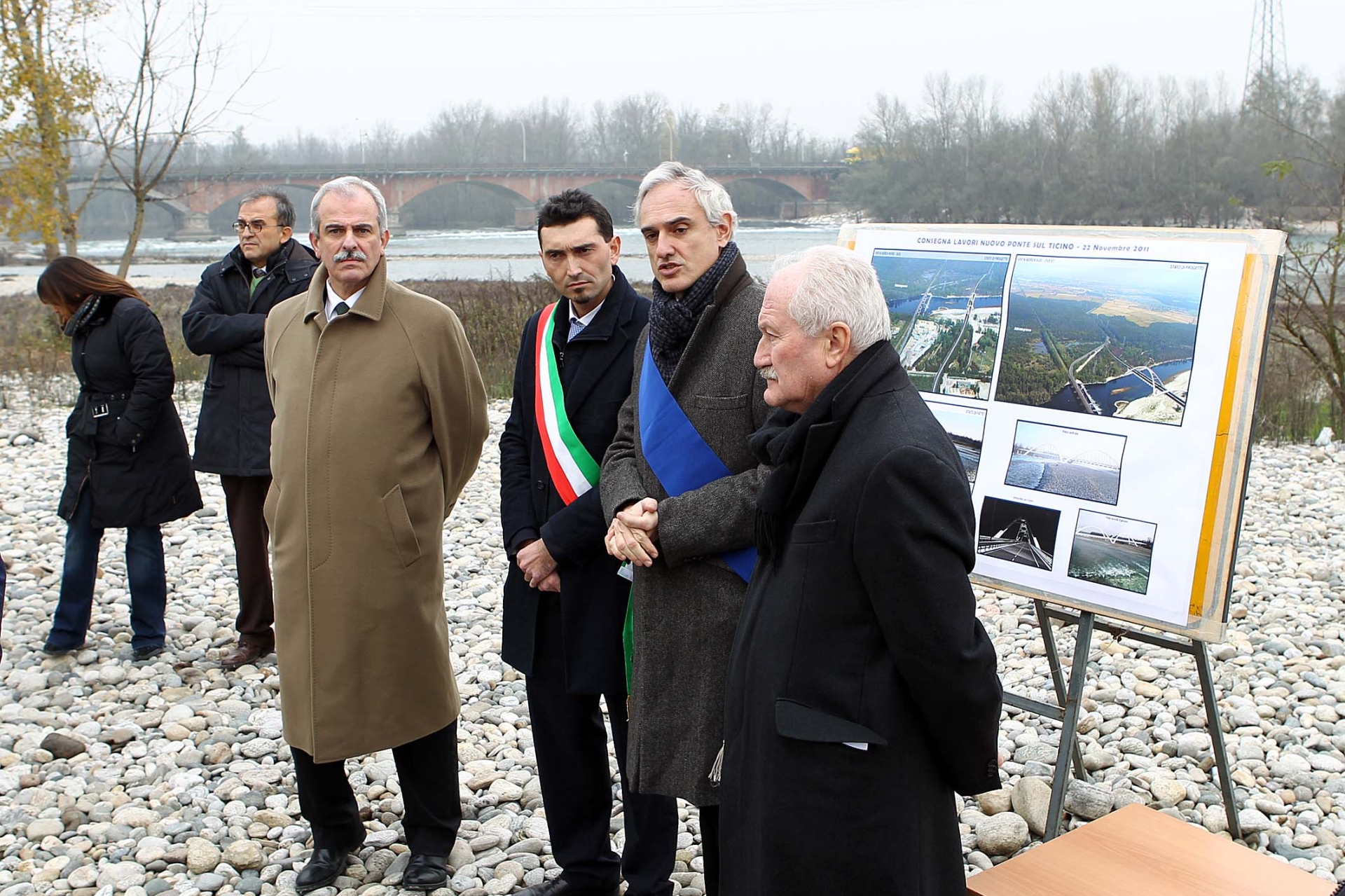 Novembre 2011, viene posata la prima pietra del nuovo ponte. Alla cerimonia, da sinistra: il senatore Roberto Mura, il sindaco di Vigevano Andrea Sala, il presidente della Provincia di Pavia Daniele Bosone e l'assessore provinciale ai lavori pubblici Maurizio Visponetti. I lavori vengono affidati a Cesi di Imola, un autentico colosso del settore