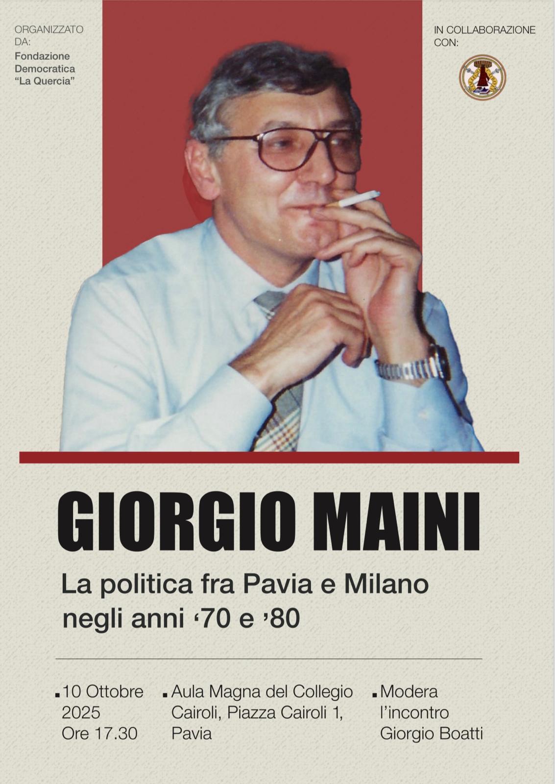 “Giorgio Maini - La politica fra Pavia e Milano negli anni ‘70 e ‘80” è il titolo della discussione promossa dalla Fondazione La Quercia, che sarà moderata dal giornalista e scrittore Giorgio Boatti. Il programma prevede, dopo i saluti del rettore del Cairoli Andrea Zatti, gli interventi di amici e compagni di “avventura” di Maini a Pavia (anche avversari) e nella corrente riformista del Pci a Milano, i cosiddetti “miglioristi”, guidati a livello nazionale da Giorgio Napolitano. Parleranno l’ex parlamentare Pci e Pds Gianfranco Borghini, l’economista e storico Giulio Sapelli, l’ex dirigente del Pci milanese e ora scrittore di successo Lodovico Festa, l’ex dirigente Anpi pavese Annalisa Alessio, il sindaco di Pavia Michele Lissia, l’ex deputata Pci e Pds Romana Bianchi, l’ex dirigente di Lotta Continua Lanfranco Bolis, l’ex consigliere regionale Pd Carlo Porcari, l’ex assessore pavese Vincenzo Lista, l’ex capogruppo Dc a Pavia Vittorio Vaccari. Concluderanno il dibattito il presidente della Fondazione La Quercia Giacomo Galazzo e il segretario provinciale del Pd Simone Marchesi.
