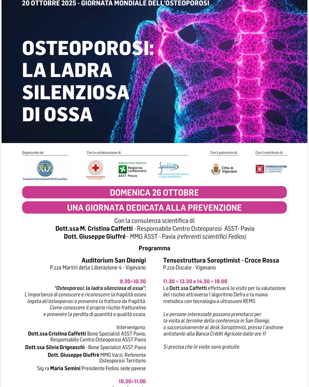 La prevenzione diventa concreta nel pomeriggio: dalle 11.30 alle 12.30 e dalle 14.30 alle 18.00, nella Tensostruttura Soroptimist – Croce Rossa in Piazza Ducale, sarà possibile sottoporsi a visite gratuite di valutazione del rischio osteoporotico, effettuate dalla dott.ssa Caffetti. Le valutazioni utilizzeranno l’algoritmo Defra e la tecnologia a ultrasuoni REMS, metodiche innovative per una diagnosi precoce della fragilità ossea.