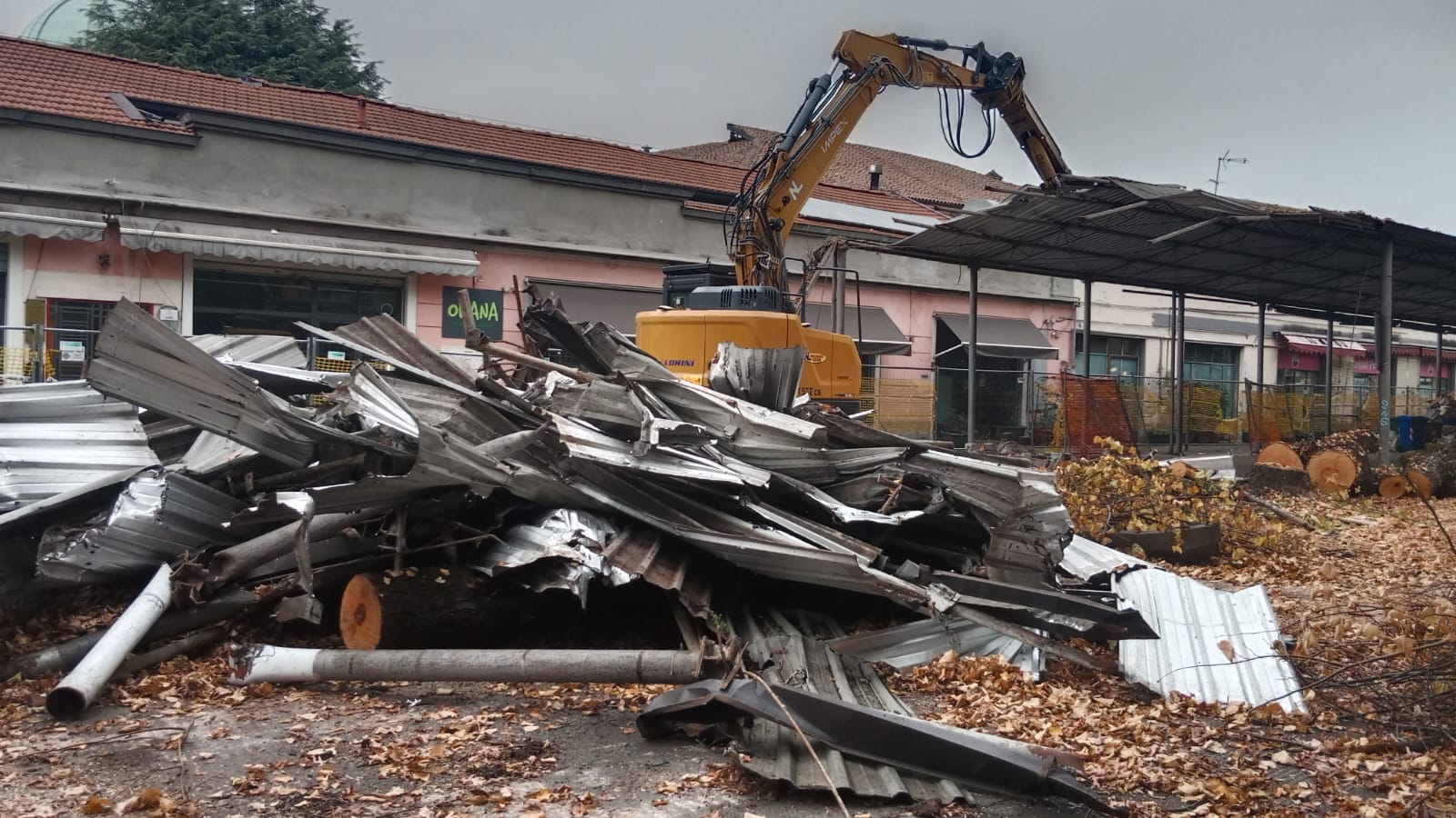VIGEVANO - Da oggi sarà ex mercato coperto, perchè la struttura che da sempre copriva l'area è in corso di demolizione. La ruspa dell'impresa appaltatrice dei lavori ha iniziato stamattina a stritolare il metallo della pensilina ed è probabile che termini l'opera entro la giornata.