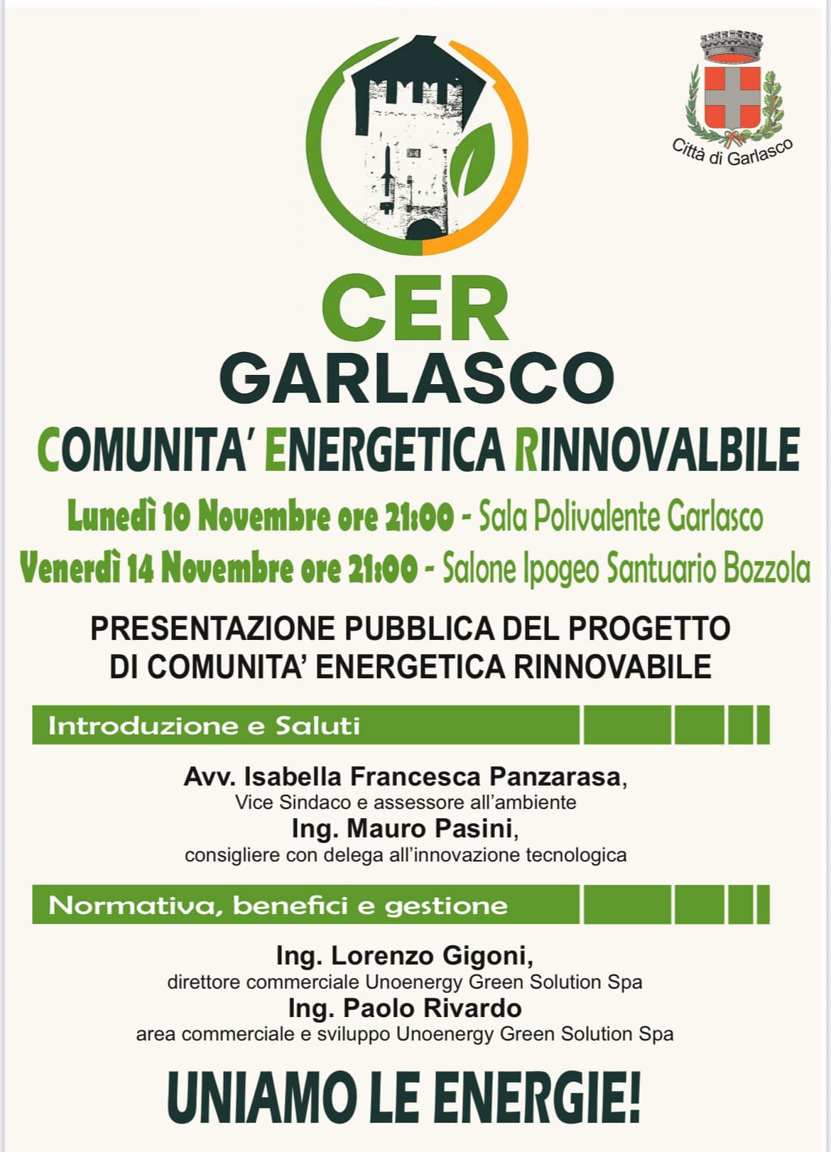 La prossima settimana sono in calendario due incontri rivolti ai cittadini per presentare il progetto della Cer, la comunità energetica rinnovabile, che è stata costituita dal comune di Garlasco. Si terranno lunedì 10 novembre, alle 21, presso la sala polivalente di via Santissima Trinità, e venerdì 14, alla stessa ora, nella sala Ipogeo del Santuario della Madonna della Bozzola. Le Cer sono aggregazioni di diversi soggetti – oltre al Comune ed enti pubblici, vengono coinvolti cittadini e aziende – che si mettono insieme con un obiettivo comune: produrre e poi condividere energia che proviene da fonti rinnovabili. Per i cittadini le Cer rappresentano un'opportunità concreta di risparmiare sui costi delle bollette e contribuire alla produzione di energia "pulita" e alla riduzione dell'inquinamento.