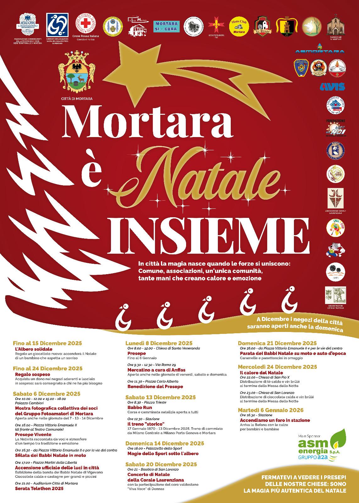 Le prime iniziative partono il prossimo 6 dicembre con l’appuntamento più atteso che è quello dell’accensione delle luci in città, l’esibizione della banda dei Babbi Natale e in piazza del Municipio cioccolata calda e castagne. Tutti presenti con il commissario prefettizio alle 17. Mezz’ora prima una sfilata di Babbi Natale in moto e dal mattino una mostra del Gruppo Fotoamatori a Palazzo Cambieri. In auditorium alle 21 la Serata Telethon. Da lunedì 8 dicembre (festa dell’Immacolata) il presepe nella chiesa di Santa Veneranda; in via Roma il mercatino a cura di Anffas, aperto poi nei giorni di venerdì, sabato e domenica. Tra gli appuntamenti più avanti nel tempo la Babbo Run (sabato 13 dicembre); la Magie dello sport sotto l’albero (14 dicembre ore 18 al palazzetto); il Concerto della corale Laurenziana (sabato 20 dicembre alle 21). La parata dei Babbi su auto e moto d’epoca si riproporrà domenica 21 dicembre alle 16. Nuova l'iniziativa promossa da Mortara Si-Cura al 6 gennaio per l’Epifania, quando il piazzale della stazione si accenderà e arriverà la Befana. Altre iniziative sono “L’albero solidale” fino al 15 dicembre e il “Regalo sospeso” per chi ne ha più bisogno, nei vari negozi cittadini.