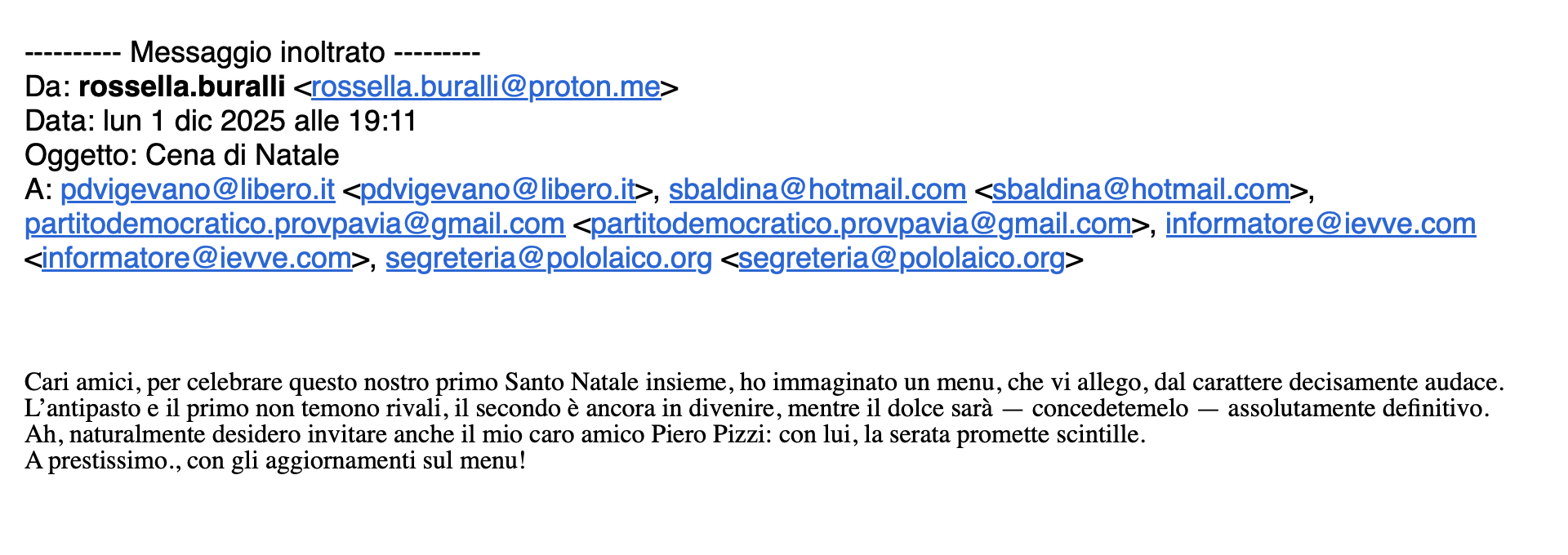 La mail inviata dal falso indirizzo "Rossella Buralli e il testo che annuncia il menu natalizio