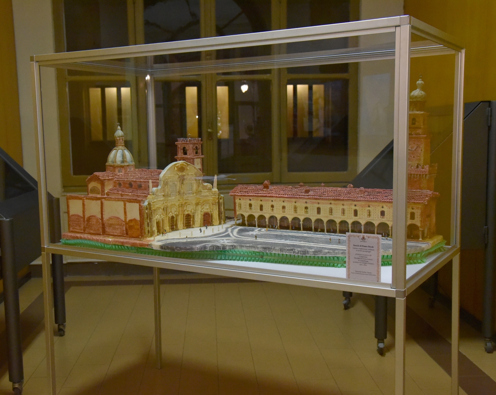 Giovedì scorso, durante la seduta del consiglio comunale, l’aula consiliare si è trasformata per alcuni minuti in un palcoscenico di celebrazione e gratitudine. Il sindaco Andrea Ceffa e la giunta hanno voluto rendere omaggio al maestro di pasticceria Andrea Savino, autore di un’opera davvero unica nel suo genere. Savino ha scelto di donare alla città una creazione di alta pasticceria che raffigura l’amata piazza Ducale, simbolo indiscusso del patrimonio artistico vigevanese. La scultura, realizzata con straordinaria perizia tecnica e senso estetico, riproduce con grande dettaglio la scenografica armonia della piazza, diventando immediatamente oggetto di ammirazione. Realizzata in (zucchero per pastigliaggio) e prodotta in occasione del Campionato Mondiale di cucina artistica in Lussemburgo e premiata anche con la medaglia di bronzo nell’anno 2014.