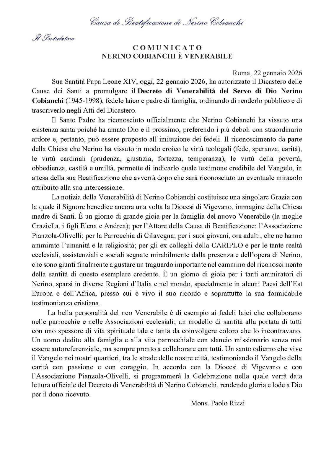 Nerino Cobianchi è stato dichiarato "Venerabile" con un decreto promulgato oggi, giovedì 22 gennaio, e autorizzato dal papa Leone XIV nel corso dell'udienza con il cardinale Marcello Semerano, Prefetto del Dicastero delle cause dei santi. Di Cobianchi – fedele laico e padre di famiglia, nato il 25 giugno 1945 a Velezzo Lomellina e morto il 3 gennaio 1998 a Cilavegna, fondatore dell'associazione Pianzola Olivelli – sono state riconosciute le "virtù eroiche". La causa di beatificazione, avviata nel 2019 in occasione del ventennale della sua scomparsa, è in corso.