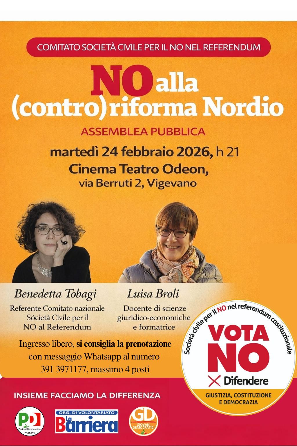 VIGEVANO - Il Comitato per il NO al referendum sulla giustizia approda anche a Vigevano su invito del Pd, in collaborazione con l’associazione “La Barriera”. Martedì prossimo (24 febbraio, alle 21) al Cinema Teatro Odeon di via Berruti 2, si svolgerà un incotro con la giornalista e scrittrice Benedetta Tobagi. Parteciperà anche la vigevanese Luisa Broli, docente di scienze giuridico-economiche e formatrice.