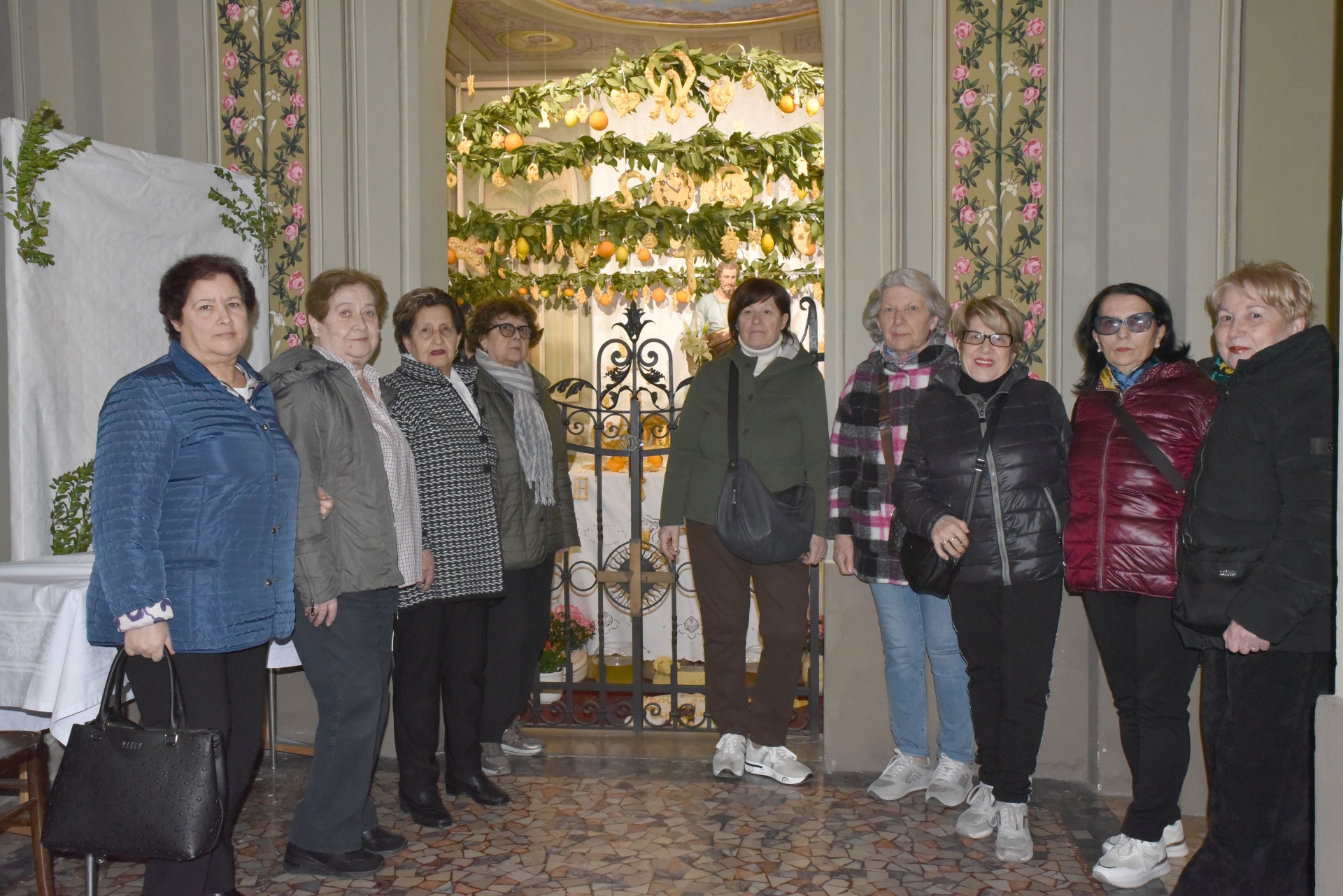 Altare composto da pane benedetto, cotto con cura nel forno e lavorato con sorprendente abilità. Ogni elemento è stato pensato nei minimi dettagli: dalla croce ai candelabri e alle strutture decorative. Tutto è stato plasmato con maestria utilizzando l’impasto. Il risultato è un’opera che unisce tradizione, fede e arte, capace di colpire lo sguardo e suscitare emozione. Le forme armoniose e la precisione delle lavorazioni testimoniano un notevole livello artistico. Accanto alle creazioni in pane, sono stati aggiunti limoni e arance che arricchiscono l’altare con colori e profumi. Le volontarie hanno dimostrato come anche materiali semplici possano diventare strumenti di espressione artistica. Un esempio significativo di devozione vissuta attraverso la bellezza e la condivisione.
