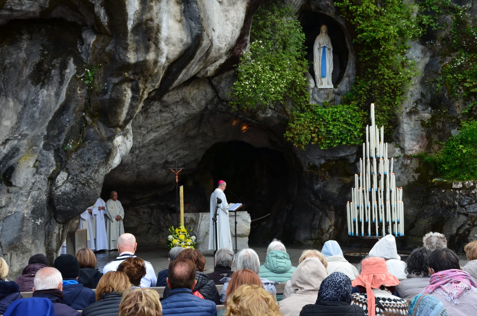Il vescovo di Vigevano Maurizio Gervasoni mentre recita il rosario alla Grotta di Massabielle, luogo delle apparizioni mariane (foto A. Villaraggia)
