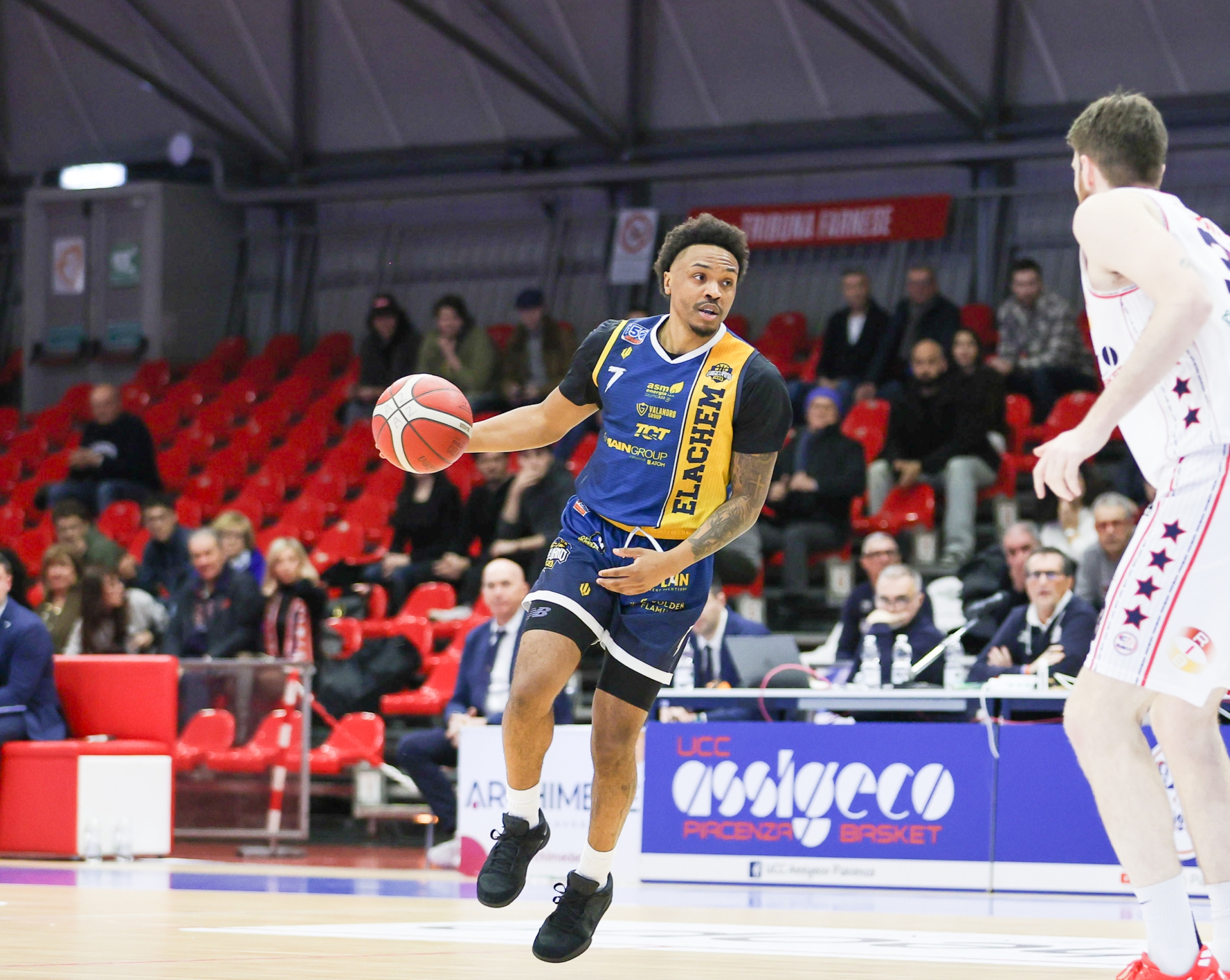 La partita si snoda prevedibilmente su ritmi alti, soprattutto per quello che riguarda Piacenza. Il tempo per Smith di cancellare un tiro di Serpilli e di Stefanini per aprire lo score ducale e i ducali provano ad allungare con un piazzato dal mezzo angolo di Smith che fa 4-7 con 7’10” da giocare. Marks spinge i suoi alla riscossa con una tripla del 7-9 che apre l’8-2 di parziale dell’Assigeco che passa per una schiacciata di D’Almeida e per un canestro e fallo su Bonacini. Leardini accorcia ma è la Elachem che deve rincorrere gli ospiti. Raspino imbecca Leardini e sulla seconda schiacciata di D’Almeida coach Pansa va in timeout. Marks appoggia troppo facilmente al ferro, così Vigevano si affida alla vecchia guardia: e sono proprio quattro liberi di Rossi e un appoggio da sotto di Peroni a consentire ai ducali il rientro per il 20-19 del 10’.