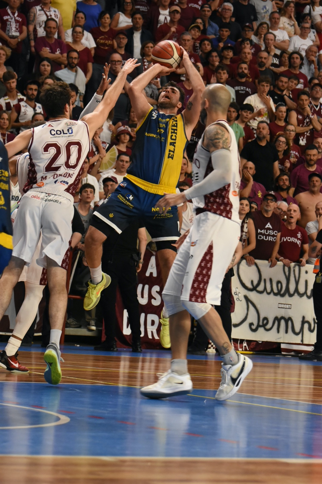 Nella sera in cui i 200 caldissimi sostenitori gialloblù, sono guidato da personaggi che hanno scritto la storia del tifo ducale, la Elachem con una tripla di Galassi e con un appoggio di Raspino. Allinei spezza il digiuno labronico, poi Smith commette un ingenuo antisportivo su Fantoni. Francis, come già in gara-4 braccato da Allinei, ciuffa il 6-12 con 5’31” sul cronometro. Livorno si affida a Banks, 8 punti nella prima frazione. E’ però Douvier a indovinare la tripla frontale alla quale replica subito Peroni e l’inerzia è nelle mani ducali. La tendenza si consolida quando Italiano, già in panchina, dopo un fallo fischiato a Rossi, incassa tecnico ed espulsione che fruttano 6 liberi e palla per gialloblù. L’attacco ducale funziona, Francis imbecca Strautmanis per il 15-25 poi Bargnesi riduce per il 18-25 del 10’.