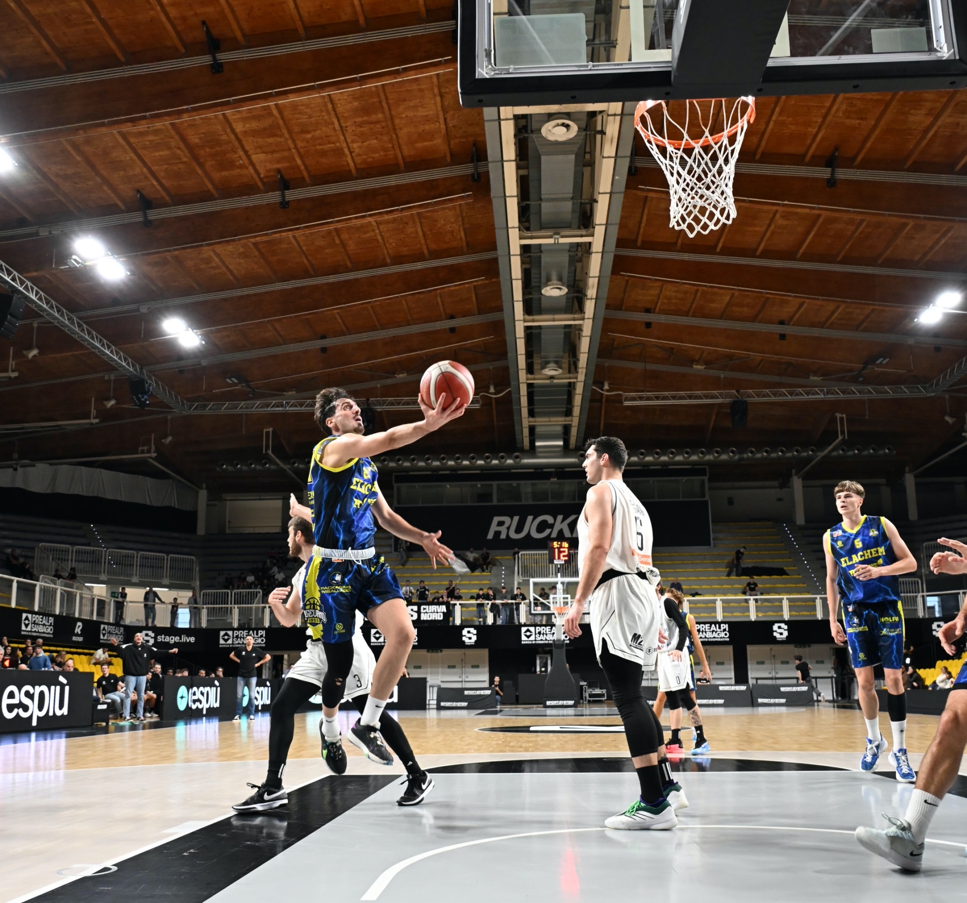 Allora si gioca tutto in 10’. Vigevano non riesce mai ad accorciare e quando ci prova i veneti trovano un paio di giocate di energia che la tengono a distanza (84-72 con 7’34” riamanenti). A 6’48” Kancleris stoppa, si fa tutto il campo e scarica senza però evitare lo sfondamento e la Elachem resta a 6 punti di ritardo. I ducali perdono però il lituano per falli quando alla fine mancano 4’30” e per i gialloblù è una grana. La Elachem è viva: Verazzo va in zingarata al ferro per il canestro e fallo dell’88-82 con 3’ e mezzo alla fine e bonus veneto andato. Due liberi di Zacchigna e un canestro in fade alimentano il sogno e portano i ducali a soli 2 punti e timeout Rucker sul parziale dello 0-7 ducale con 1’51”sul tabellone. Mazzantini ha due liberi per portare Vigevano ad un solo punto di distacco, ma ne segna solo uno e così la Rucker attacca per vincere. Ci pensa Picarelli a disegnare il missile dall’arco lontano per il +5 (94-89) che decide il match.
