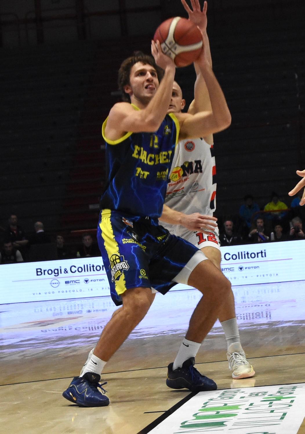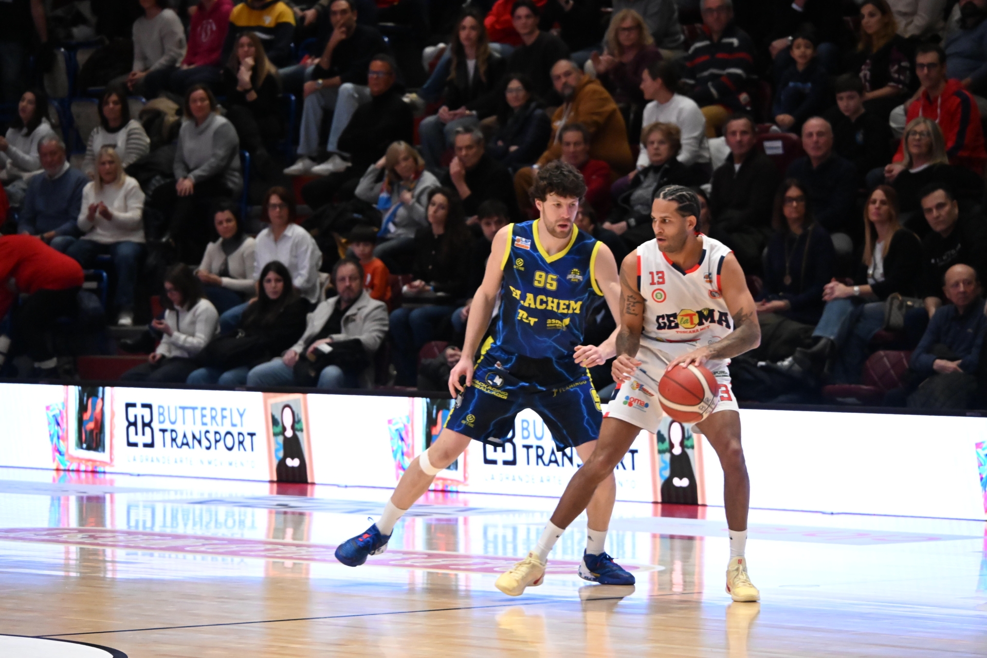 Sette minuti spettacolari ad avvio partita non bastano alla Elachem Vigevano per compiere l'impresa al palaCarrara di Pistoia dove a passare con pieno merito è la Gema Montecatini (89-69). La differenza tra le due squadra si vede con il passare dei minuti, con il dominio termale sotto i cristalli (51-34 il computo dei rimbalzi); in più la Elachem ha poco da molti giocatori, a parte Kancleris, Boglio sino a pochi minuti dalla fine e Gajic che però resta in campo solo 22' perché limitato dai falli. Coach Salieri non ha nessuno a cui aggrapparsi quando la partita sta per svoltare e così i gialloblù non riescono mai a chiudere il gap e riaprire davvero il match.