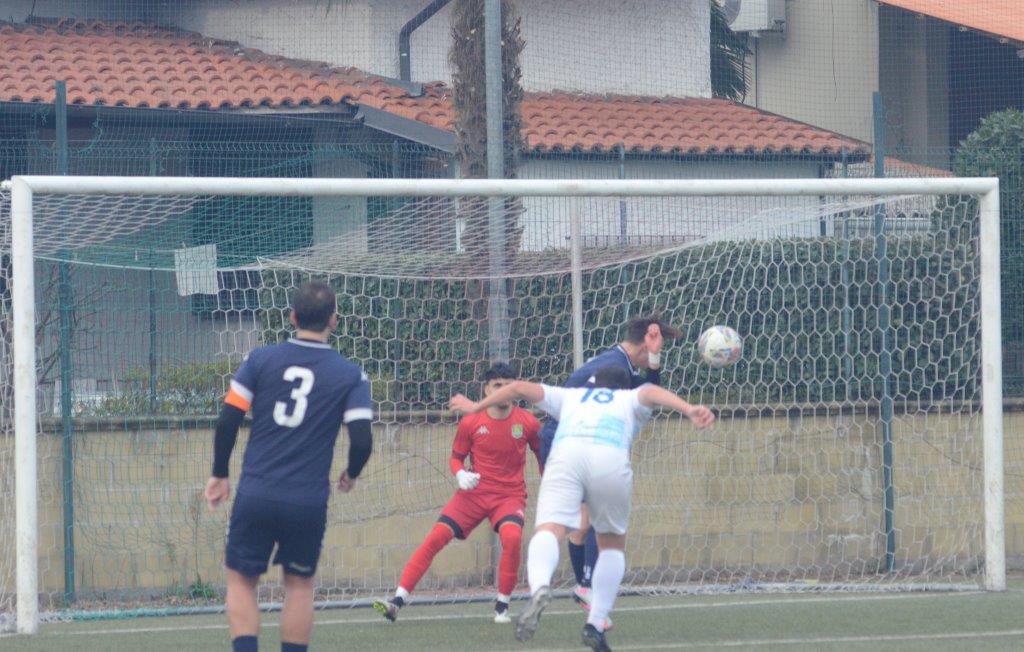 L'incornata di Lagonigro che ha messo al sicuro il risultato (foto Paolo Marinoni)