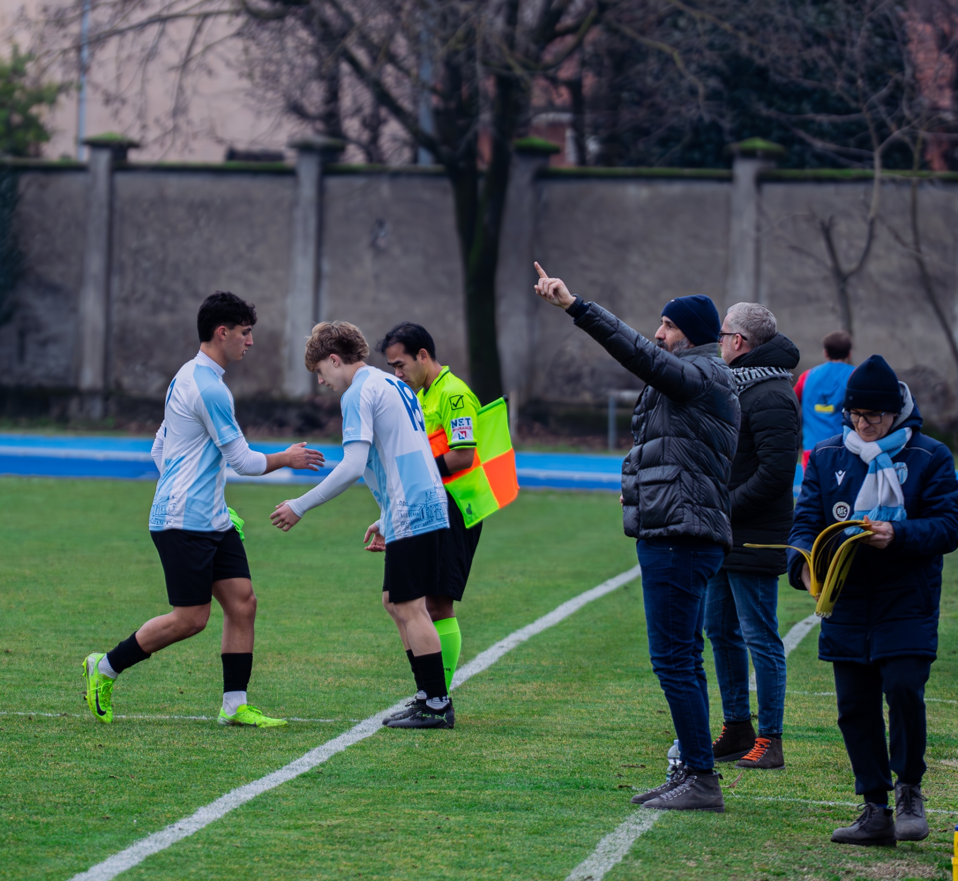 Mister Cataldo dà indicazioni alla squadra durante un cambio (foto Vigevano Calcio)
