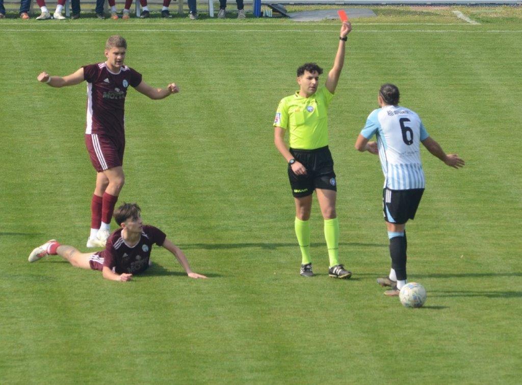 Cherubini steso a terra, l'arbitro mostra il cartellino rosso a Mzoughi (foto Paolo Marinoni)
