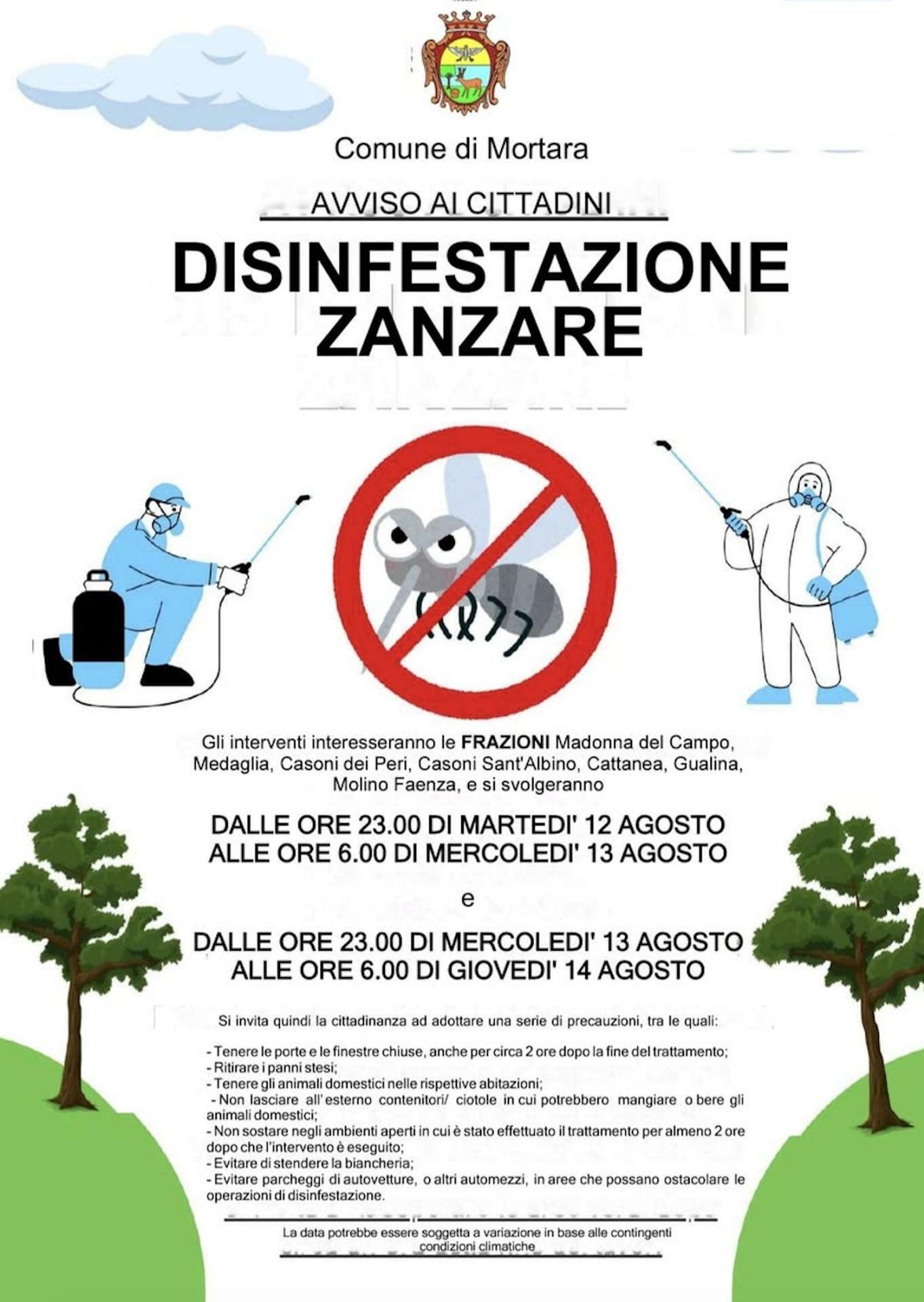 L’intervento di disinfestazione che si terrà nelle notti tra il 12 e il 13 agosto e in quella successiva è propedeutico a ridurre il numero delle zanzare presenti e (non si dice chiaramente, ma è implicito) a evitare possibili contagi di malattie portate da questi insetti. Ultimamente l’allarme è stato lanciato a causa di alcuni casi di virus West Nile che si sono verificati anche in Lomellina. La disinfestazione, così come la prevenzione e l’utilizzo personale di creme o spray deterrenti sono fondamentali specialmente in zone dove le zanzare sono presenti in grandissima quantità. Gli interventi programmati dalla città di Mortara sono illustrati in una locandina pubblicizzata sul proprio profilo social dalla vicesindaca Laura Gardella. Interesseranno le frazioni Madonna del Campo, Medaglia, Casoni dei Peri, Casoni Sant'Albino, Cattanea, Gualina, Molino Faenza, e si svolgeranno