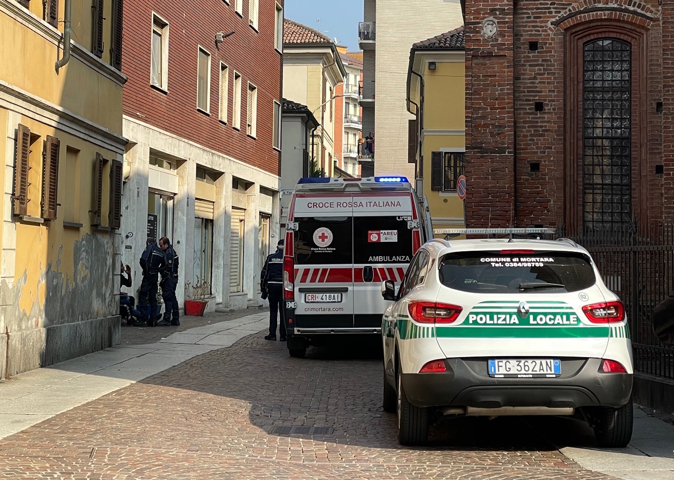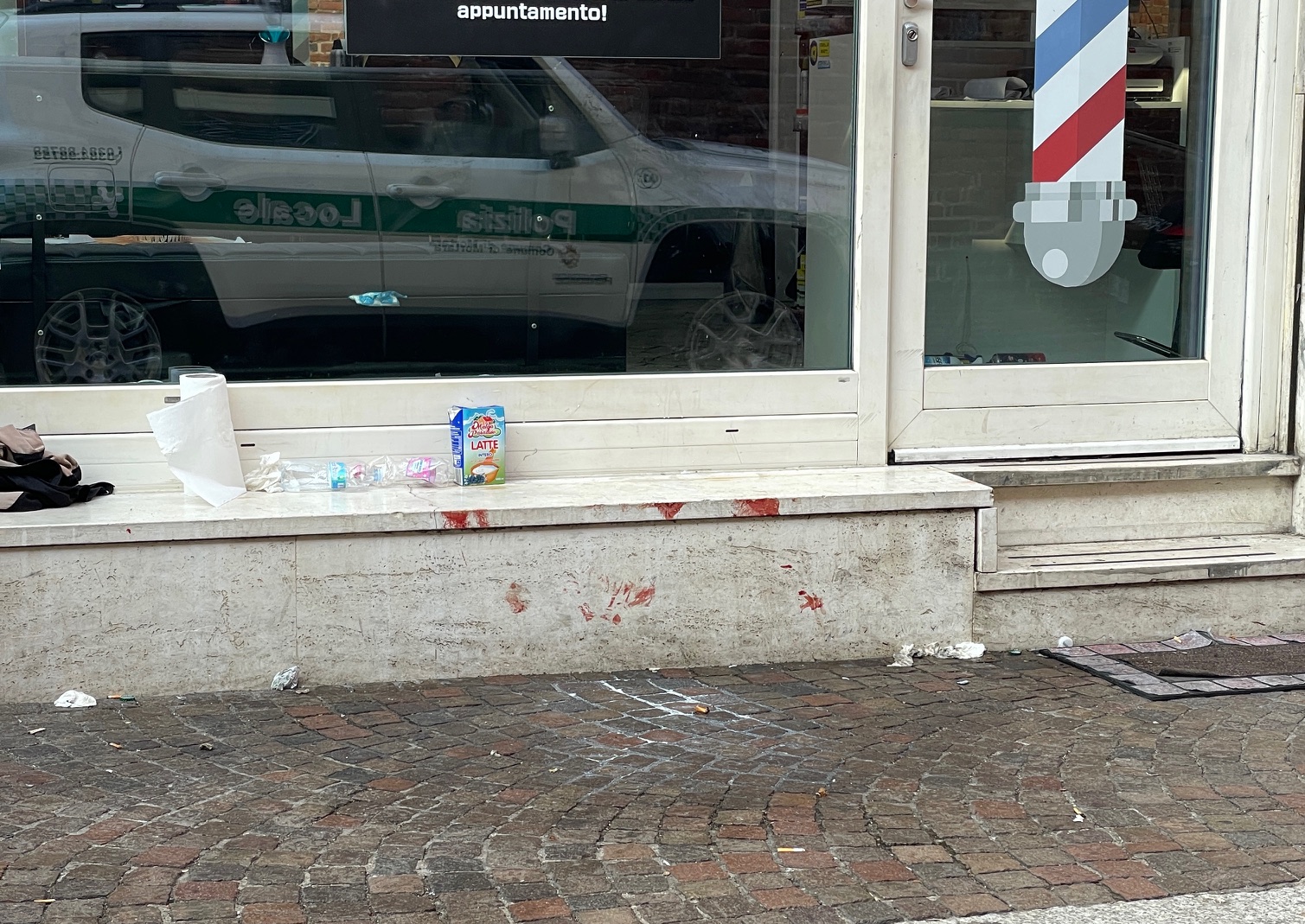 Carabinieri e polizia locale in Contrada San Lorenzo a Mortara e il sangue lasciato dalle ferite sugli scalini del negozio da parrucchiere