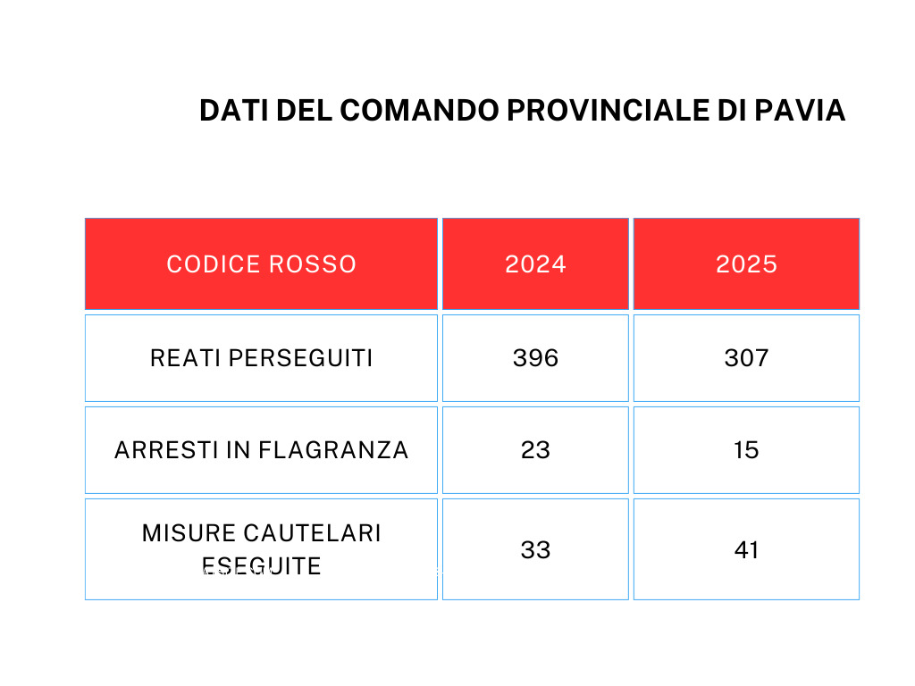 In provincia di Pavia, lo scorso anno l’Arma ha perseguito 396 reati, eseguendo 23 arresti in flagranza e 33 misure cautelari; i dati del 2025 sono in linea, ma si evidenzia un aumento significativo delle misure cautelari eseguite, che finora sono state 41.