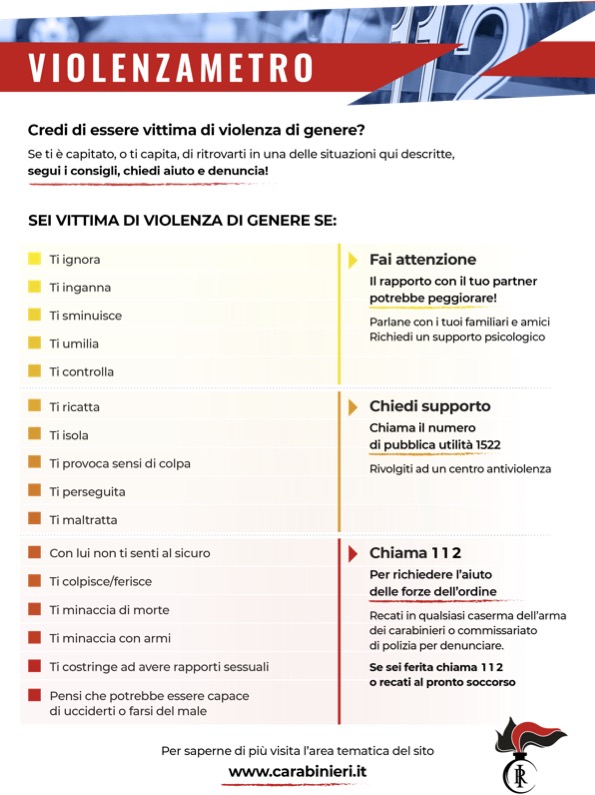 Sul sito ufficiale dell’Arma è disponibile una sezione dedicata al “Codice Rosso”, con materiali informativi e un test autovalutativo – il “Violenzametro” – che può aiutare le vittime a riconoscere la gravità delle condotte subite.