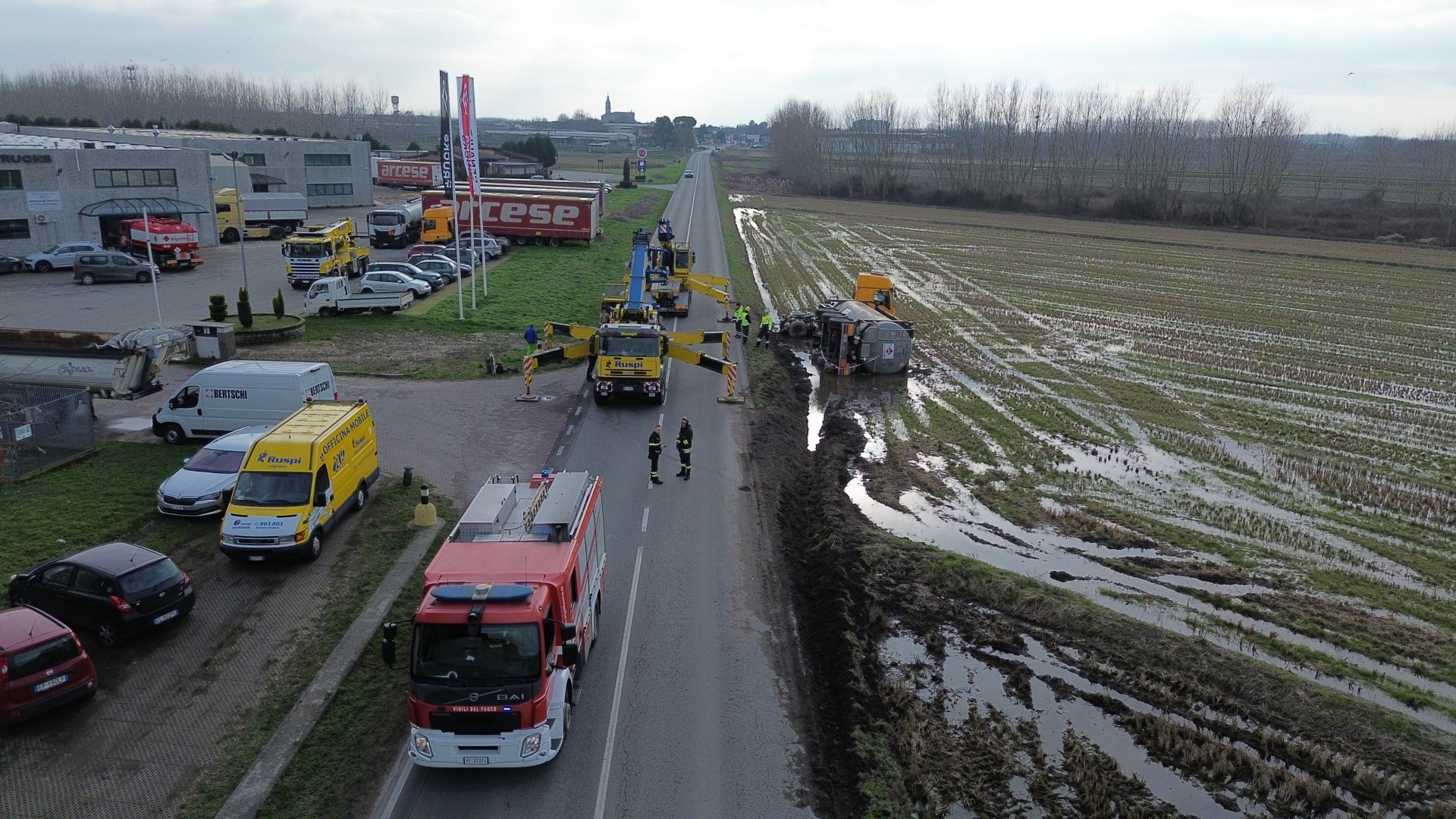 Un mezzo pesante con cisterna è finito fuori strada, ribaltandosi, sulla provinciale 192, nel tratto di rettilineo tra Cilavegna e Gravellona Lomellina. L’incidente si è verificato giovedì pomeriggio, poco dopo le 15. Non si registrano feriti, ma la strada è stata chiusa al traffico per consentire le operazioni di recupero. Sul posto è subito intervenuta una squadra di vigili del fuoco di Vigevano per le operazioni di messa in sicurezza; il camion trasporta sostanze pericolose e infiammabili – nello specifico acetato di etile, un solvente che ha diversi utilizzi industriali –, ma stando alle prime informazioni non ci sarebbero stati sversamenti.
