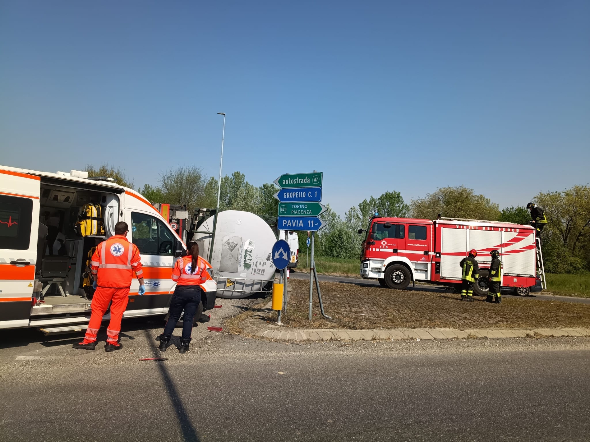 I soccorsi alla rotonda di Gropello e il camion cisterna ribaltato