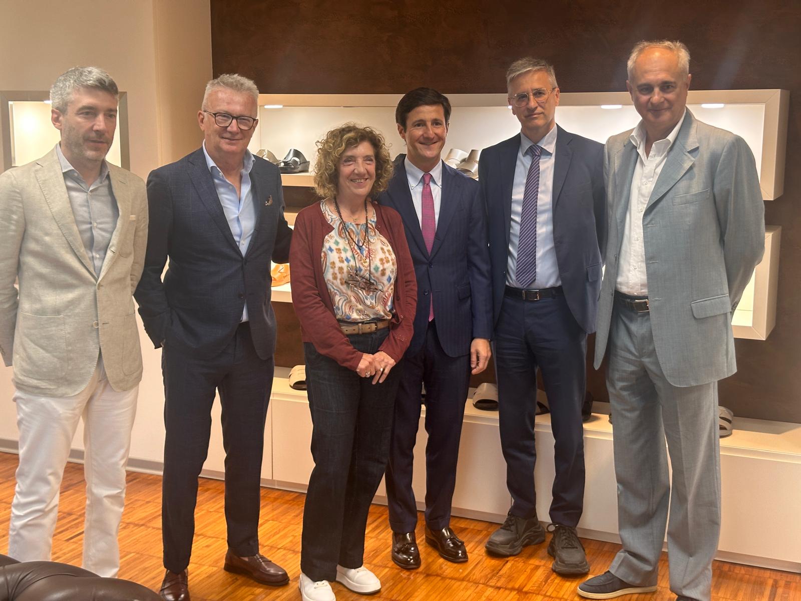 Il presidente Rossini è stato accolto da Carlo Pietro Ruggero (presidente) e dai rappresentanti legali Alessandro Ruggero e Daniela Giannotti. Il calzaturificio Almini nasce nel 1921 a Vigevano, grazie a Pietro Almini e alla sua maestria artigiana appresa a Milano. Con la moglie Giovanna apre il primo laboratorio, dove ogni scarpa è realizzata su misura, secondo metodi tradizionali. Negli anni ’40 la figlia Fernanda introduce una linea di eleganti scarpe per bambini, espandendo il marchio in Europa. Negli anni ’80, il figlio Carlo Pietro rilancia la produzione maschile e reinterpreta il sandalo arabo con gusto italiano e tecniche innovative. Nasce così un prodotto di lusso, oggi presente in oltre 50 boutique nei paesi del Golfo.