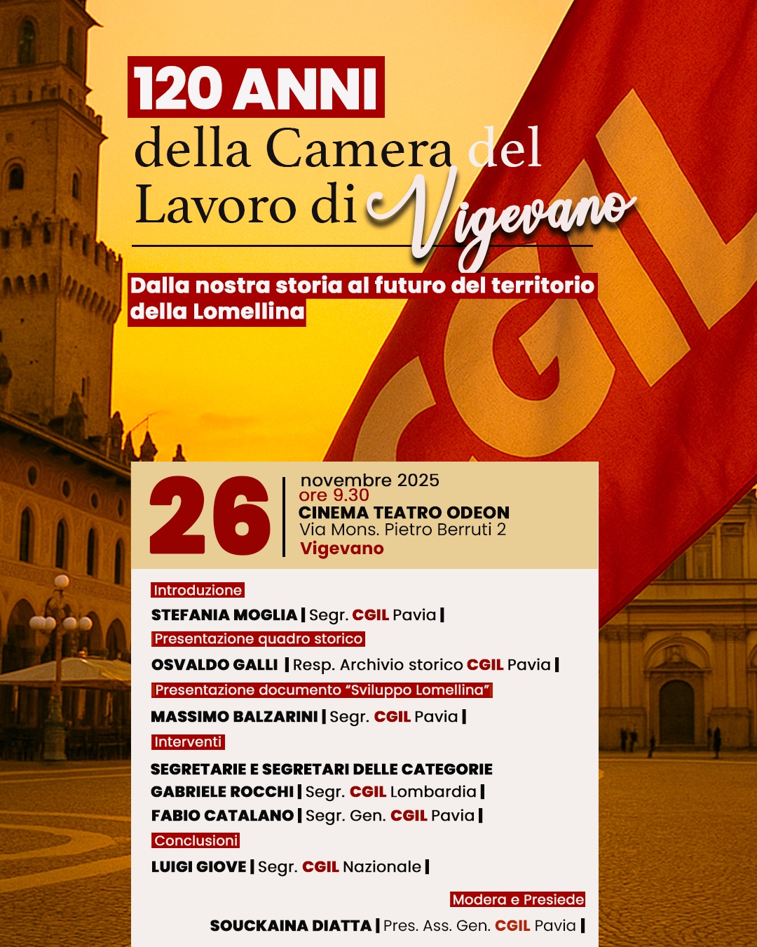 VIGEVANO - Compie 120 anni la Camera del Lavoro di Vigevano e per celebrare la ricorrenza storica la Cgil pavia ha organizzato un convegno che si svolgerà mercoledì 26 novembre a partire dalla 9.30 al cinema Odeon (via Berruti 2).