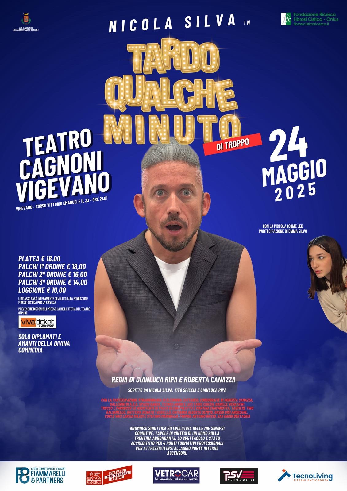 L’appuntamento con “Tardo qualche minuto (di troppo)” è per sabato 24 maggio alle 21.01 («siate puntuali»), scritto dallo stesso Nicola Silva con Tito Spiccia e Gianluca Ripa, con la regia dello stesso Ripa e Roberta Canazza. Il ricavato sarà devoluto interamente alla Fondazione Fibrosi Cistica per la Ricerca e su questo Nicola Silva evidenzia: «È l’unica cosa che conta e per una volta sono serio».