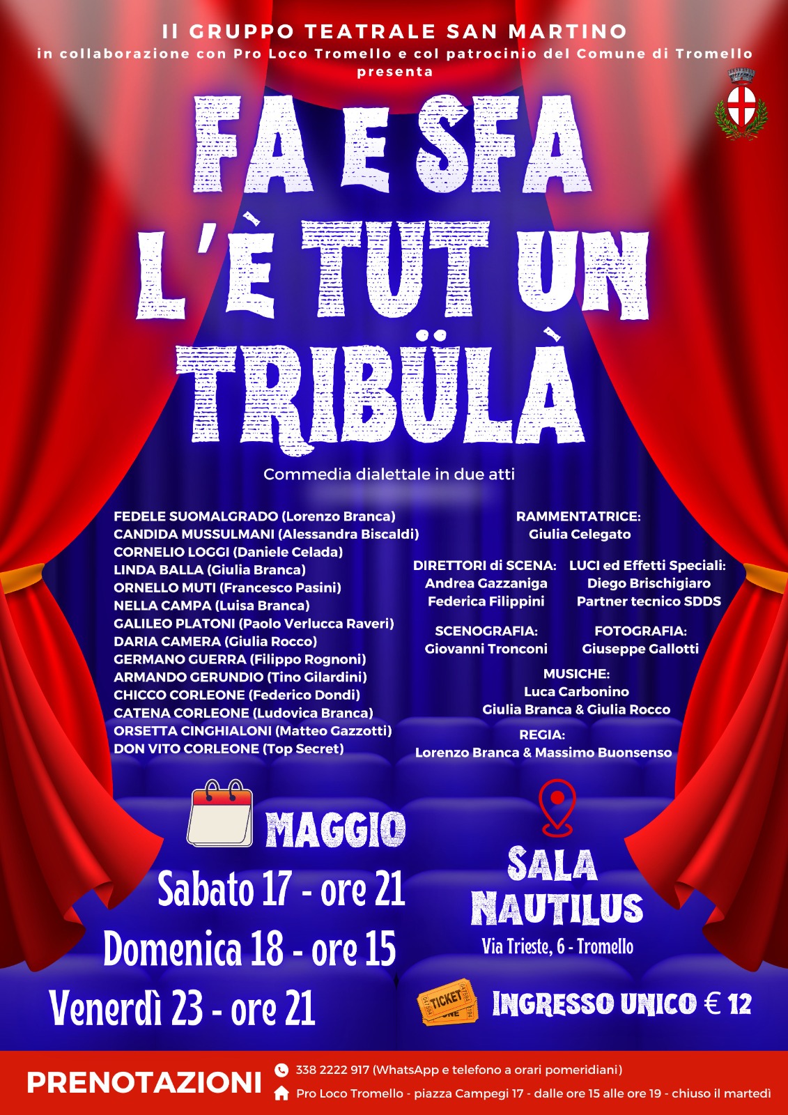 Il teatro dialettale a Tromello è più vivo che mai, con la compagnia San Martino. Il gruppo teatrale storico ritorna con una commedia originale, il cui copione ne riprende un’altra di quindici anni fa. Saranno quattro le date per “Fa e sfa l’è tüt un tribulà”, commedia dialettale in due atti. Andrà in scena sabato 17 maggio alle 21, domenica 18 alle 15 e venerdì 23 maggio alle 21 presso il salone Nautilus. C’è anche una quarta data, sabato 24 maggio al teatro Angelicum di Mortara, sempre alle 21.