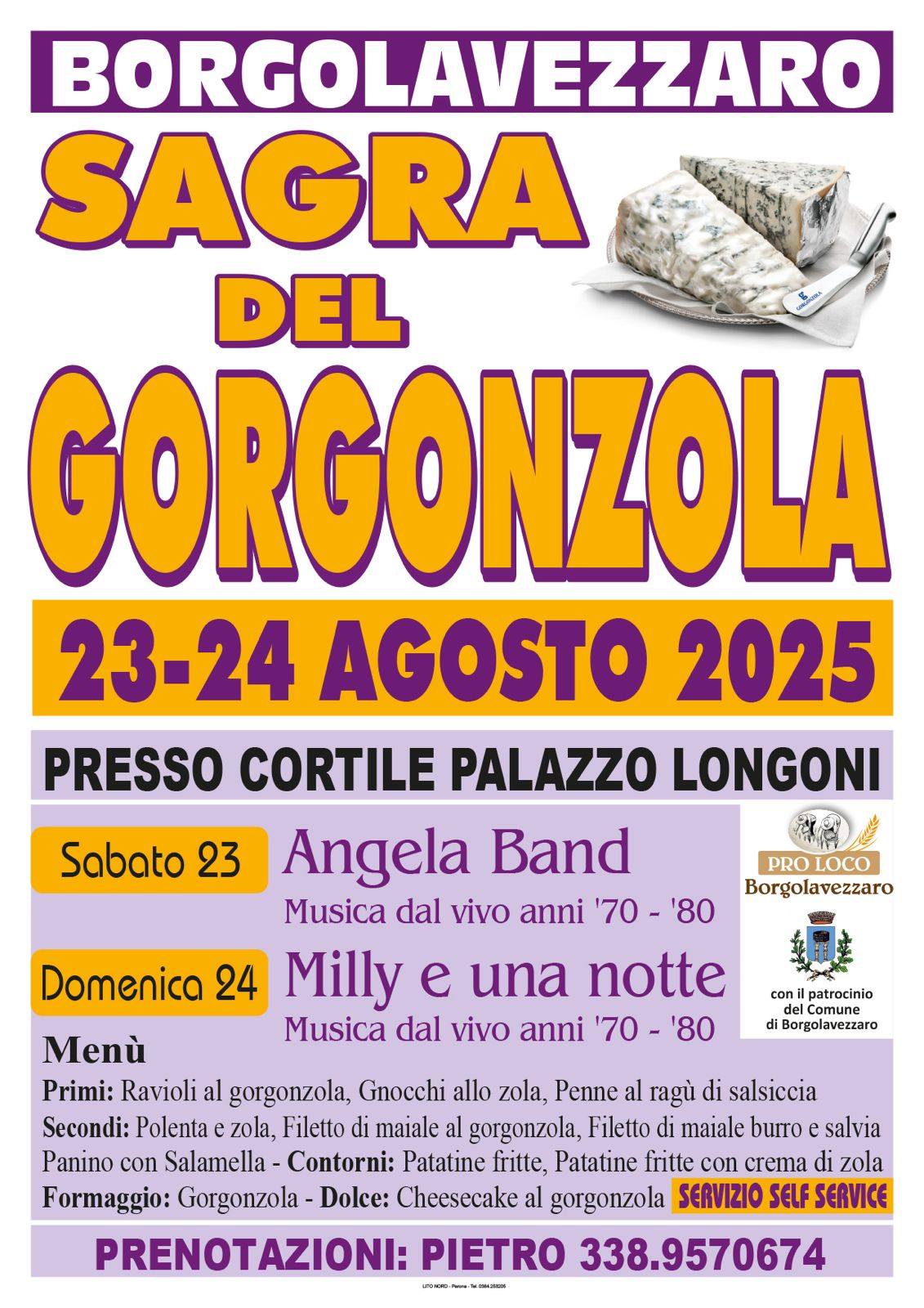 Tutto quanto, o quasi, uscirà dalle cucine sarà a base di zola: ravioli o gnocchi al gorgonzola, polenta e zola, filetto di maiale al gorgonzola (o con l’alternativa burro e salvia), patatine fritte con crema di zola al posto del ketchup, cheesecake al gorgonzola. Gli “extra” consistono nel ragù di salsiccia e nell’immancabile salamella all’interno del panino. Garantita, come nelle due sagre precedenti come la marinara (fine luglio) e dei ravioli (lo scorso weekend) anche la musica dal vivo. Il repertorio non si staccherà dai classicissimi degli anni Settanta ed Ottanta. Sabato 23 toccherà alla Angela Band, domenica 24 a Milly e una notte.