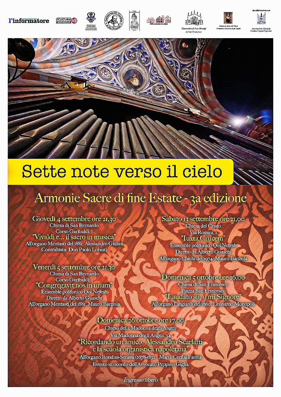 L’evento inaugurale è per giovedì 4 settembre alle 21,30 (dopo il Triduo) e vedrà protagonista l’organo costruito da Giovanni Mentasti di Varese nel 1881. Alla consolle siederà il M° Alessandro Giulini di Milano, con la partecipazione della voce da contraltista di Don Paolo Lobiati, M° della Cappella Musicale della Cattedrale di Vigevano. Il programma sarà un excursus nella musica barocca europea con particolare attenzione per Antonio Vivaldi, di cui verrà eseguito il celebre Stabat Mater. I brani organistici valorizzeranno le particolari sonorità dello strumento custodito in San Bernardo, di cui sono stati recentemente ritrovati i documenti originali.
