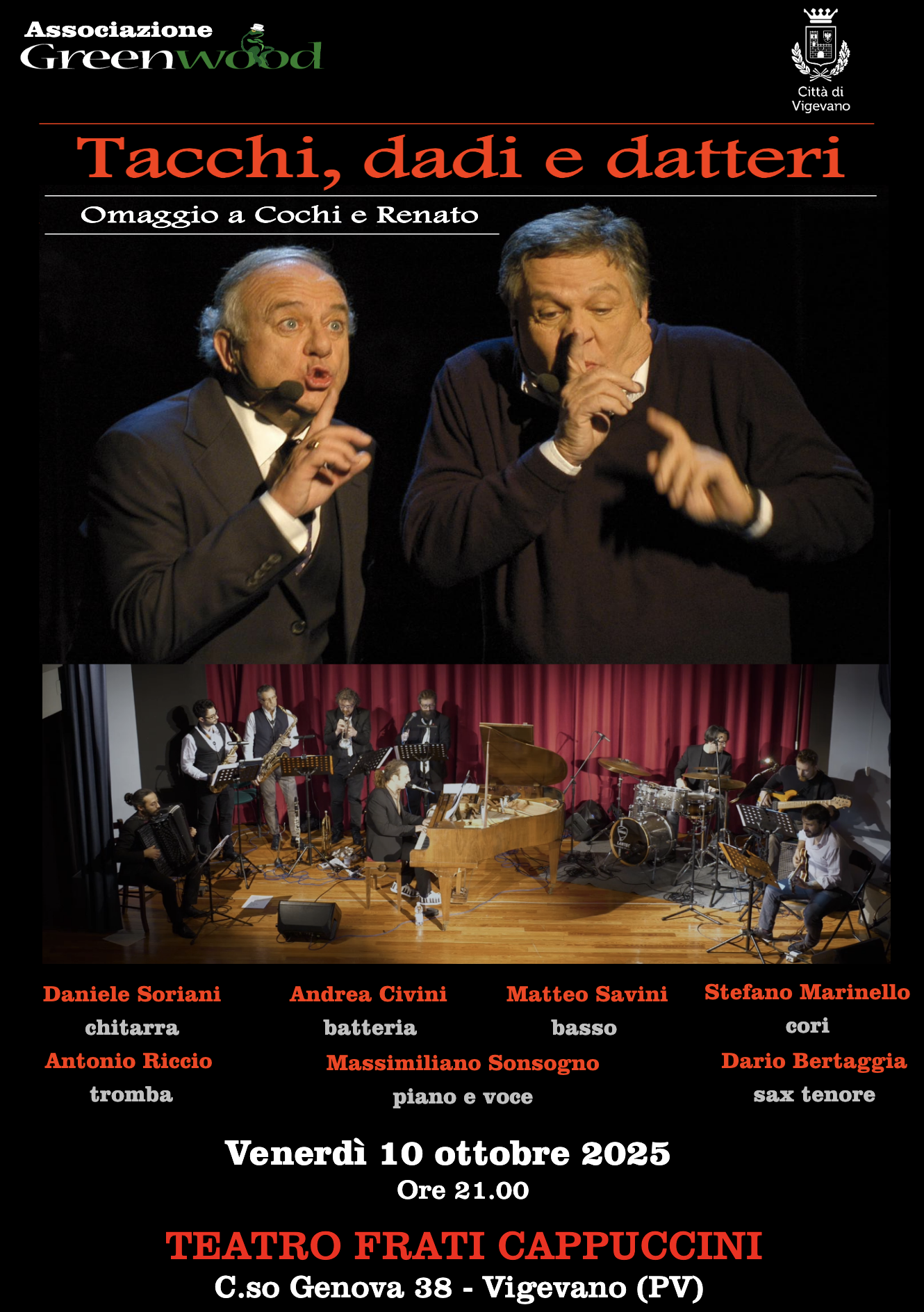 È sempre un piacere ascoltare le proposte degli Insoliti Accordi, il gruppo musicale che già la scorsa stagione ha divertito il pubblico con le canzoni di Enzo Jannacci e che quest’anno offre l’originale “Tacchi, dadi e datteri”. Sarà un omaggio a Cochi e Renato: quindi uno spettacolo musicale in cui verranno eseguiti dal vivo alcuni dei più celebri brani del duo comico milanese che ha segnato un’epoca e portato un nuovo e surreale modo di fare comicità. Il primo appuntamento della stagione “Si apre il sipario” nel teatro dei Frati cappuccini a Vigevano, in corso Genova, sarà venerdì 10 ottobre alle 21. Si esibirà un settetto: Massimiliano Sonsogno (piano e voce), Daniele Soriani alla chitarra, il trombettista Antonio Riccio, Andrea Civini con la sua batteria. Poi Matteo Savini al basso, il corista Stefano Marinello e Dario Bertaggia, sax tenore.