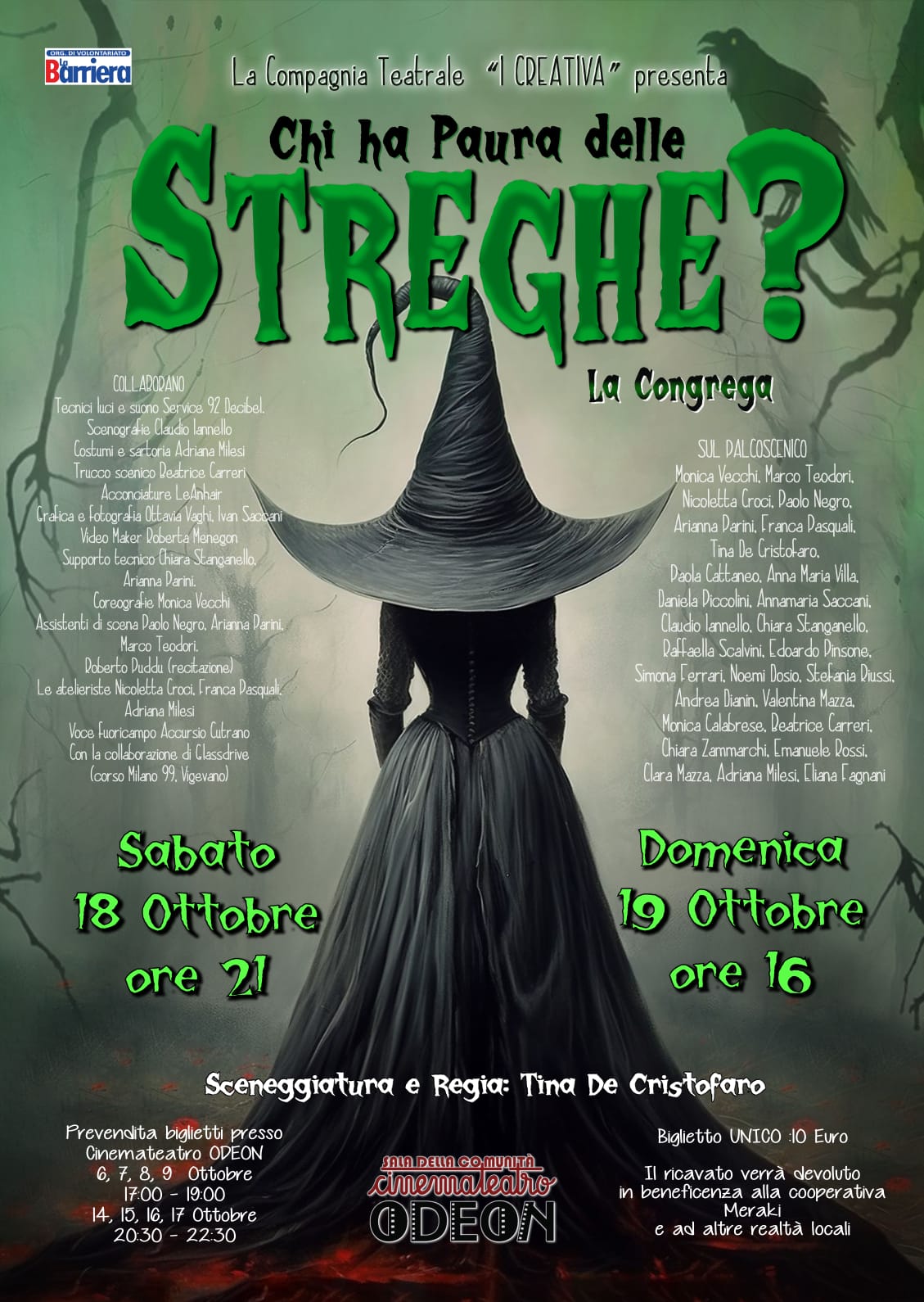 Il bello de I Creativa, associazione culturale e compagnia teatrale vigevanese, è che propongono uno spettacolo all’anno. Uno soltanto. Però la qualità è alta e il pienone è sempre garantito. Questa volta tocca a “Chi ha paura delle streghe?”. Sarà in due date al cine-teatro Odeon di via Berruti a Vigevano: sabato 18 ottobre alle 21 e domenica 19 alle 16. La sceneggiatura e la regia, come sempre, è di Tina De Cristofaro. «Al grand hotel Enchantix - è la trama - il direttore Teodoro e la sua assistente tuttofare sono in fermento, stanno arrivando le signore streghe per un congresso. Sono le streghe più famose al mondo: dei fumetti, del cinema e della televisione. Sono state convocate nientemeno che dalla potentissima Suprema, la cui cattiveria non conosce confini. Ciò che chiederà alle sue colleghe sarà qualcosa di estremo e potente, ma non tutto è come sembra. Calcheranno il palcoscenico ben 16 streghe, un mago benevolo, un segretario trasformista, un corvo, un gatto e una nonna, che aveva insegnato al nipotino come riconoscere le vere streghe e che adesso, ormai grande, andrà all’hotel a vedere cosa bolle in pentola».