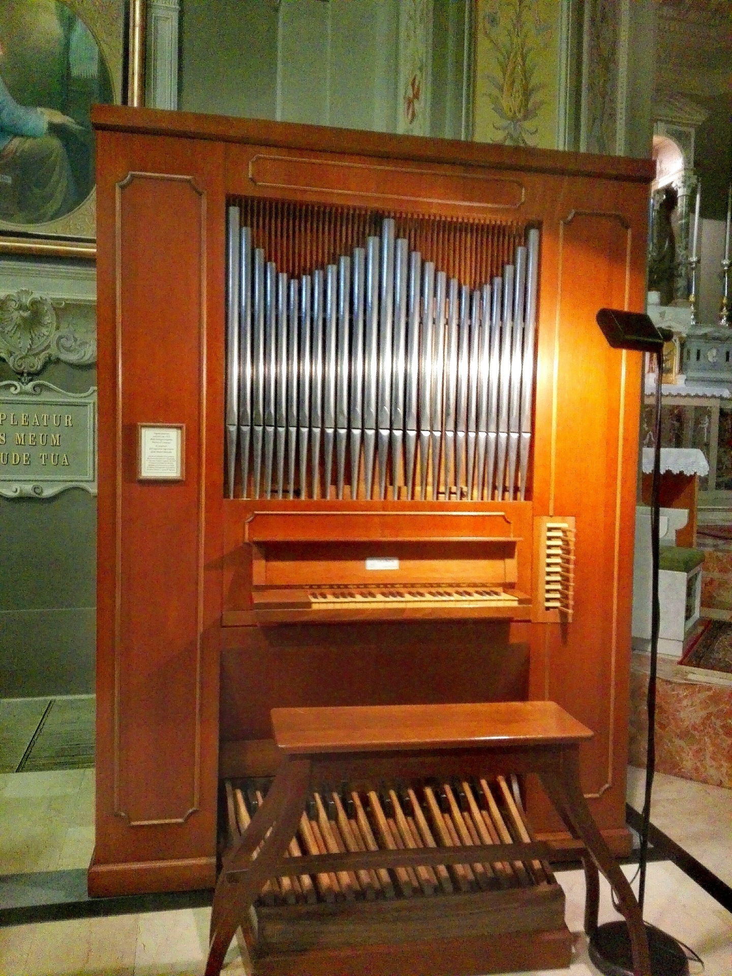 Realizzato per Erinna De Micheli, pianista e insegnante dell’Istituto Musicale “L. Costa”, lo strumento venne utilizzato per anni nella sua abitazione privata. Dopo la scomparsa della coppia, gli eredi decisero di metterlo in vendita con un’unica condizione: che trovasse una nuova casa in cui potesse continuare a suonare. Fu così che l’organista Mauro Banzòla lo acquistò e lo concesse in comodato d’uso gratuito alla parrocchia, permettendogli di vivere una seconda vita proprio dove oggi risuona durante le celebrazioni.