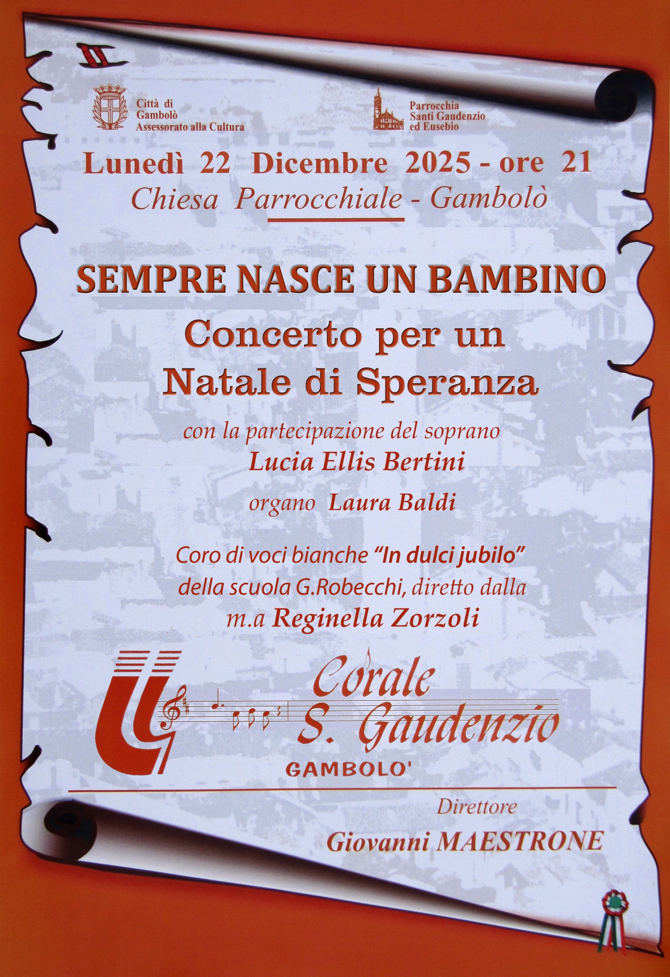 Torna uno degli appuntamenti più importanti del Natale in Lomellina: il concerto della corale San Gaudenzio di Gambolò, che si esibirà lunedì 22 dicembre, alle ore 21, nella chiesa parrocchiale dedicata ai Santi Gaudenzio ed Eusebio. Il repertorio sarà quello tradizionale natalizio; l’evocativo titolo della serata, “Sempre nasce un bambino”, richiama al tema della speranza, che ha caratterizzato il 2025 come anno giubilare. «Ritroveremo il soprano Lucia Ellis Bertini, con la sua magnifica voce – fanno sapere gli organizzatori – Insieme a lei e alla corale, si esibiranno le voci bianche del coro “In dulci jubilo” dell’istituto comprensivo cittadino “G. Robecchi”, diretto magistralmente dall’insegnante Reginella Zorzoli. La serata si concluderà con l’esecuzione, in prima assoluta per Gambolò, del maestoso “Magnificat” di Guido Gambarini, per coro ed organo; una pagina decisamente novecentesca, capace di esaltare le sonorità del coro e mettere in risalto momenti musicali delle singole sezioni, valorizzati da raffinati interventi organistici». A dirigere ci sarà, come sempre, il maestro Giovanni Maestrone, all’organo Laura Baldi. L’ingresso alla serata è libero.