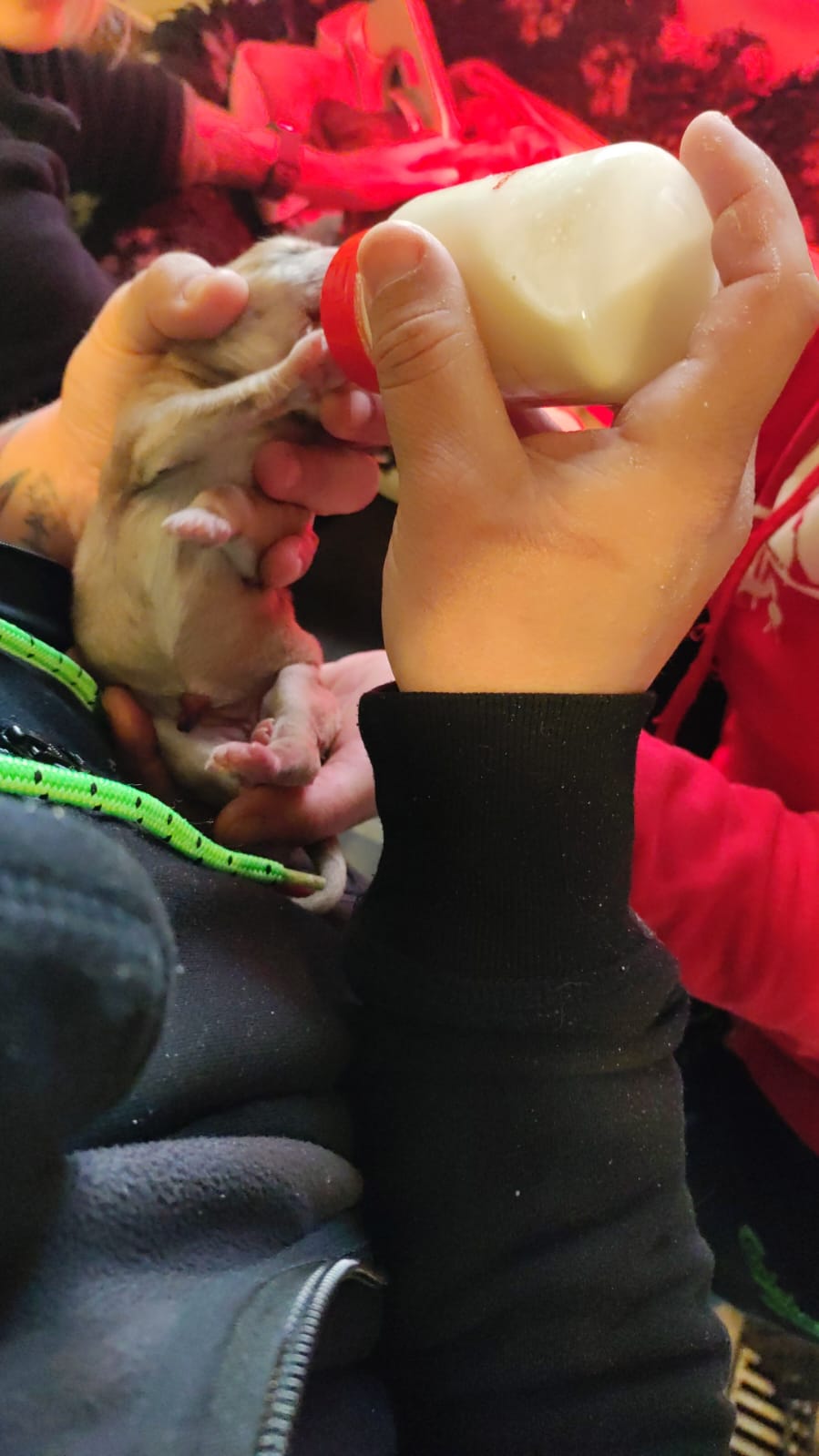 Uno dei cuccioli mentre viene nutrito con il biberon