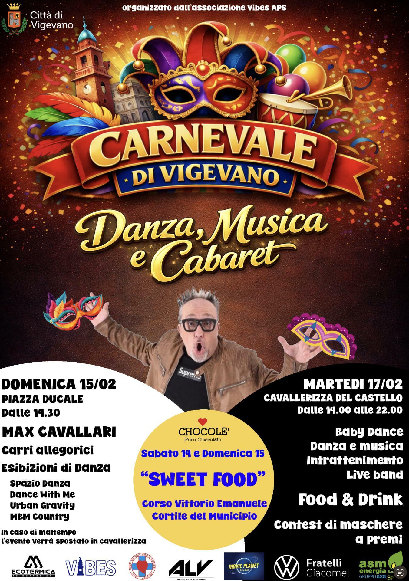 Due momenti per il Carnevale, come sempre. Bel tempo permettendo, domenica 15 febbraio due carri allegorici accoglieranno bambini in maschera e adulti in piazza Ducale. Li mette a disposizione l'Associazione Carnevale Vigevano. Saranno statici, senza corteo, per motivi di sicurezza. Dalle 14,30 un palco in piazza vedrà esibirsi le scuole di danza cittadine e il comico Max Cavallari. L'ex metà dei Fichi d'India intratterrà gratuitamente i presenti col meglio del suo repertorio tra un ballo e l'altro. Se dovesse piovere, tutto si sposta in cavallerizza.