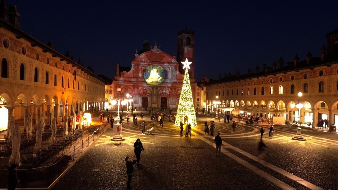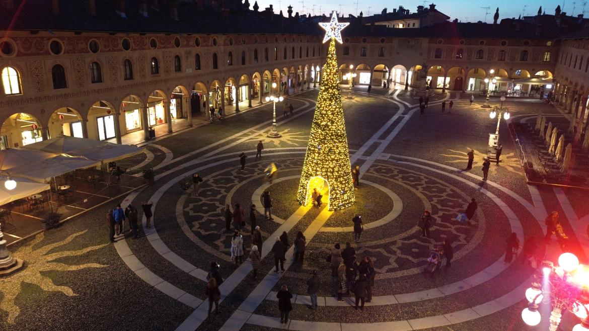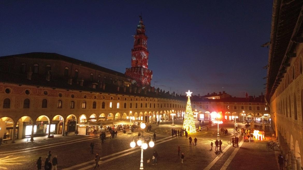 Piazza Ducale ha finalmente il suo albero di Natale. Allestito in giornata è stato illuminato nel tardo pomeriggio e accompagnerà i vigevanesi per tutto il periodo delle festività.