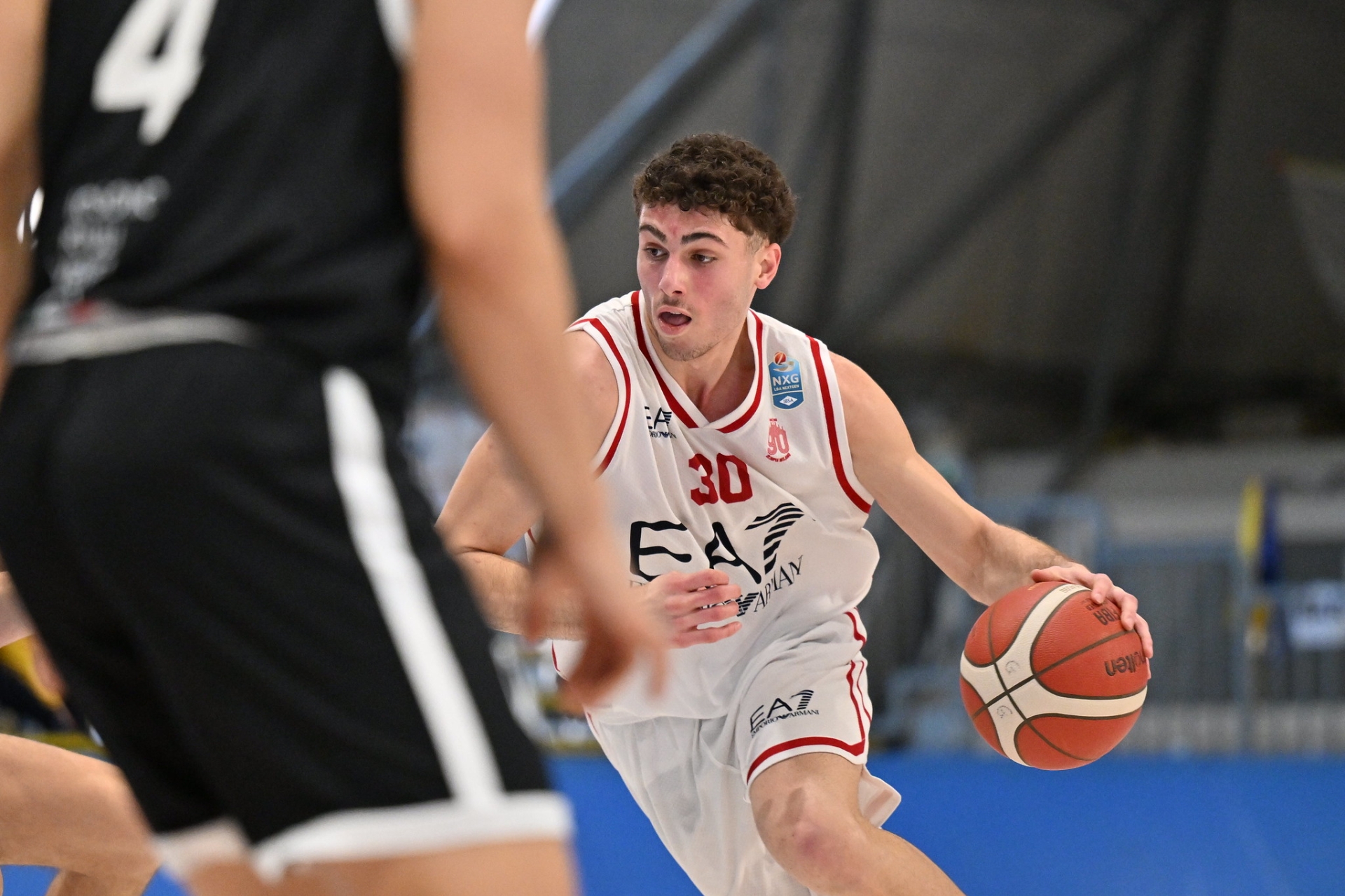 In foto: Mattia Grassi nel corso della partita contro Udine alle LBA NextGen (credits Olimpia Milano)
