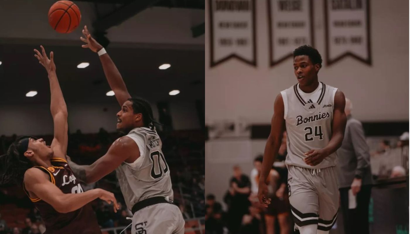 A sinistra: Frank Mithcell. A destra: Cayden Charles. Assieme a Darryll Simmons II sono stati i migliori realizzatori nella prima vittoria di Conference per i Bonnies