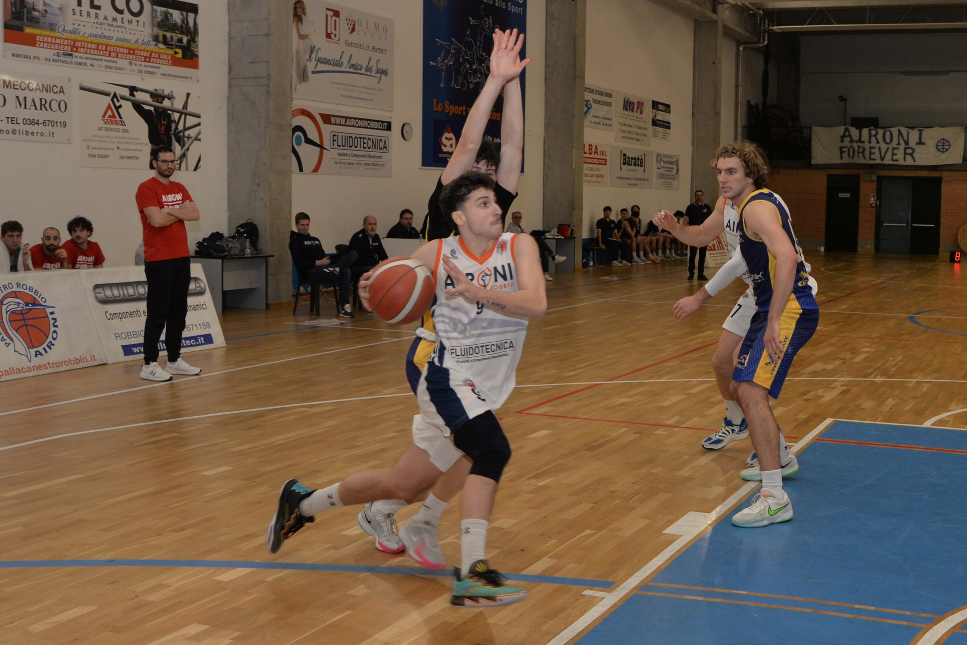 La reazione avversaria è importante, tanto da avvicinarsi di un solo possesso a ridosso dell'intervallo (32-29) ma il play n.9 degli Aironi subisce fallo è in lunetta è impeccabile e alla lunga pausa il tabellone dice 34-29. Il ritorno dagli spogliatoi vede una Fluiodotecnica aspettare gli avversari per buttare quanta più sabbia possibile negli ingranaggi del loro gioco. L'approccio più difensivista dei robbiesi infonde il coraggio per tirare un altro strappo che porta la squadra di casa avanti sopra due cifre dopo il canestro del capitano del 43-33. Tuttavia, i comaschi riescono a rientrare agilmente a causa di diversi errori nei dettagli della squadra di casa. Il terzo quarto finisce infatti 46-46.