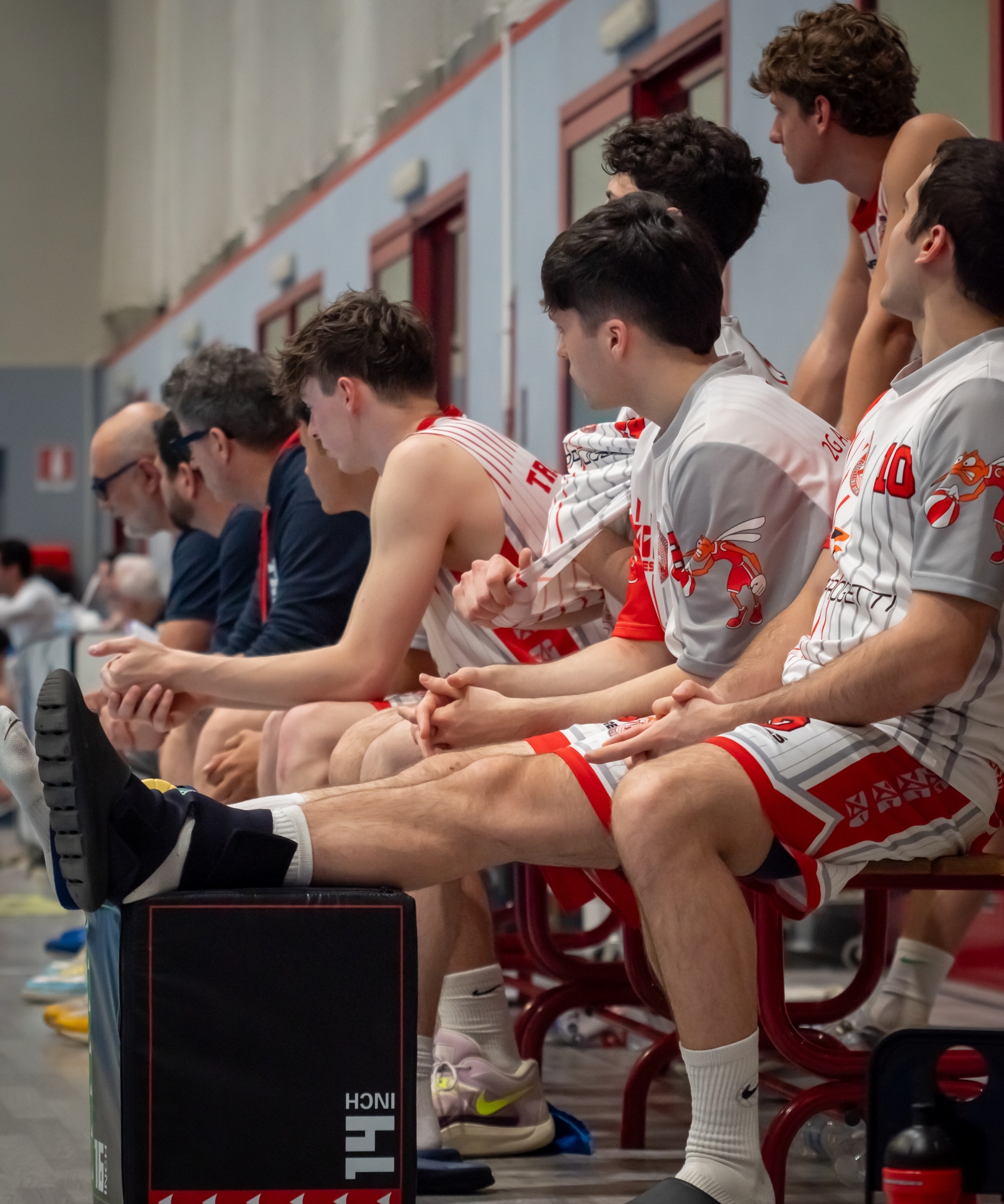 Simone Garavaglia sullo sfondo mentre osserva la partita assieme ai giocatori in panchina (foto L. Moltrasio)