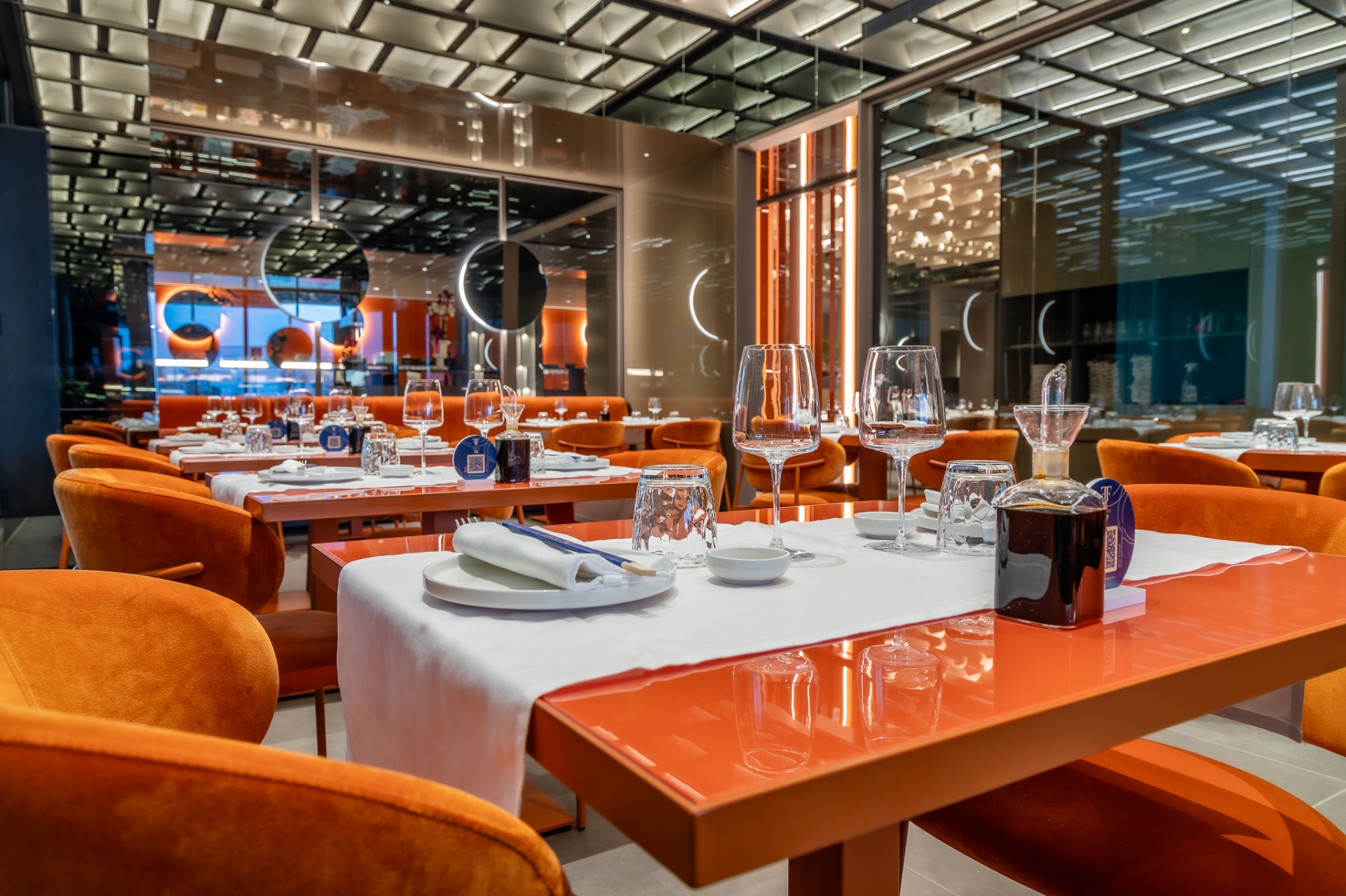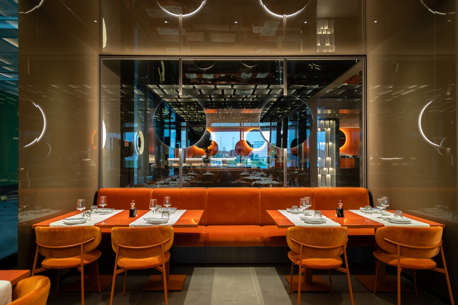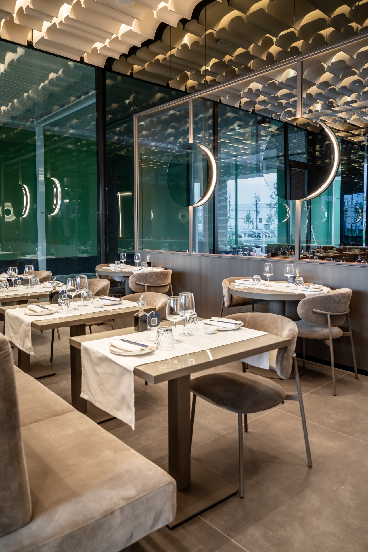 Il nuovo Found è uno spazio che cattura l'immaginazione fin dal primo sguardo. La terza location, progettata dal rinomato Lai Studio - Maurizio Lai Architects, si distingue per la sua visione innovativa e all'avanguardia nel panorama del design per la ristorazione. L'ampio ambiente è caratterizzato da sofisticati giochi di luci ed effetti materici che creano un'atmosfera sia raffinata che accogliente, frutto della maestria di Maurizio Lai nel fondere funzionalità ed estetica. Gli interni, curati nei minimi dettagli, riflettono un'eleganza senza tempo che si sposa perfettamente con la filosofia culinaria di Found.